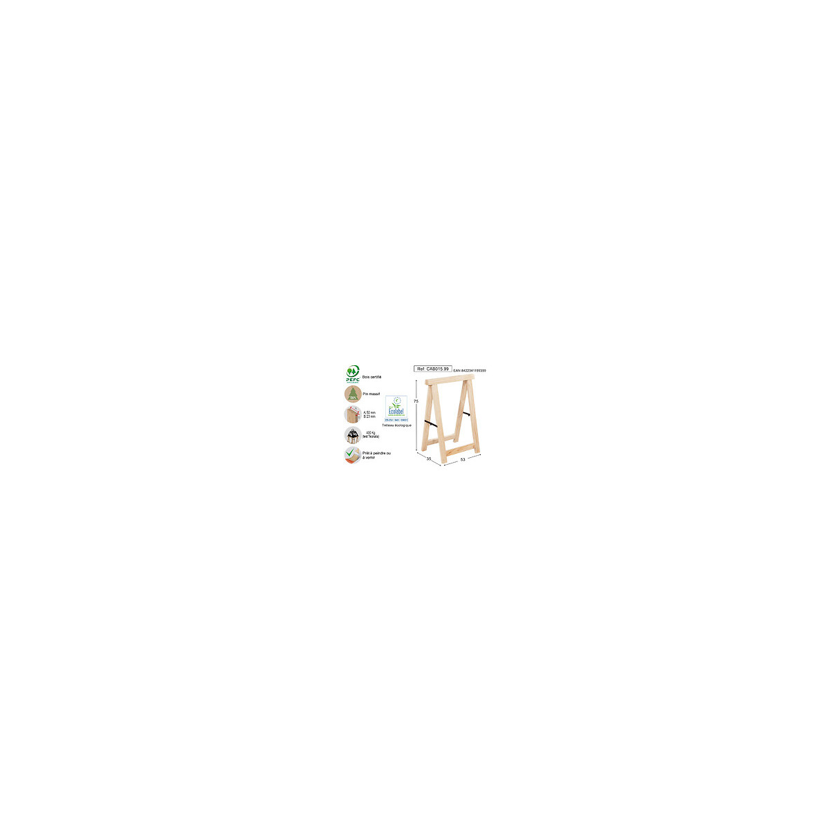 Si vous avez peu d'espace, nul besoin de renoncer à avoir un bureau ou une table de travail. Ce tréteau est parfait pour créer des tables peu profondes (53 cm). Utilisez deux tréteaux, combinez-les avec le plateau en bois de 120x60cm d’Astigarraga Kit Line, et créez une table de bricolage ou un bureau simple, mais pratique pour les petits espaces. Si vous y ajoutez des mini blocs de la même marque, vous gagnerez en rangement et créerez un ensemble complet. Deux unités supportent jusqu'à 400 kg. L'épaisseur des pieds est de 50x23 mm. Sa simplicité le rend idéal pour créer une table dans un appartement étudiant. Sa finition naturelle est idéale pour une personnalisation par la peinture ou le vernissage. Le bois de ce tréteau est doublement certifié : l'écolabel de l'Union européenne et le PEFC. Cette certification atteste que le bois d’Astigarraga Kit Line provient d'une gestion responsable des forêts locales et durables.