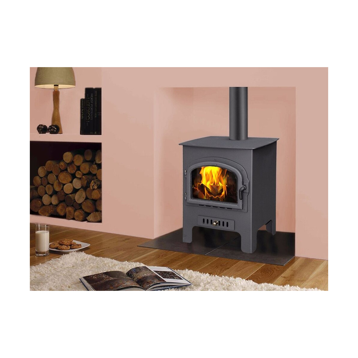 THECA OSLO Poêle à bois en tôle d'acier et fonte Cette petite poêle à bois design sur pieds offre un encombrement réduit, idéal pour les pièces de faible envergure. Sa chambre de combustion est équipée d'un revêtement réfractaire permettant d'emmagasiner la chaleur générée. Système de nettoyage de la vitre. Dimensions du poêle (H x l x P) : 605 x 507 x 408 mm Dimensions de la porte (H x l) : 215 x 300 mm Epaisseur tôle : 2,5 mm Poids : 44 kg Puissance max : 12,5 kW Rendement : 66,2 % Charge max : 3,2 kg Diamètre de sortie de fumées : 110 mm
