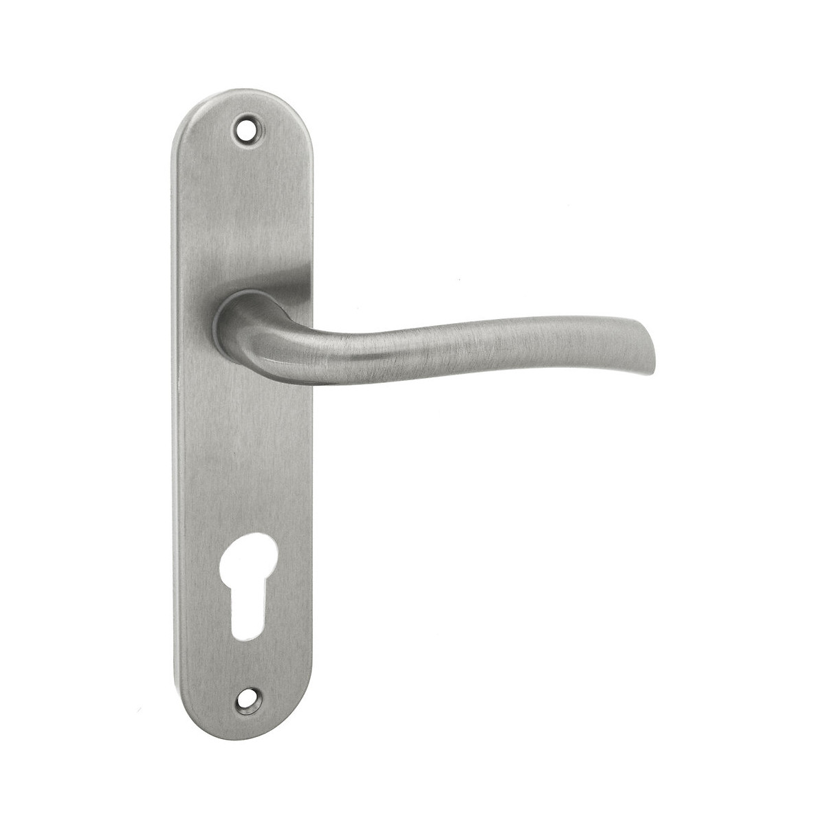 Poignée de porte Rhaspodie en zamak finition nickel mat. Garniture sur plaque à perçage cylindre. Sans ressort de rappel. Entraxe béquille/serrure standard. Entraxe de fixation 165 mm. Épaisseur de la porte : 36 mm à 42 mm. Visserie fournie. Dimensions : Longueur 13,2 cm x Profondeur 6,5 cm x Hauteur 19 cm.