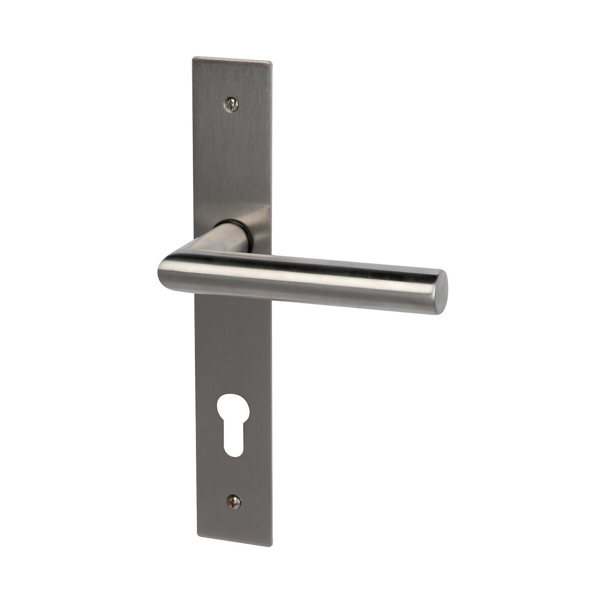 Paire de poignées sur plaque carrée fine Brunella gris nickel mat, cylindre. Entraxe de fixation 195mm. Visserie fournie.Spécifications techniques