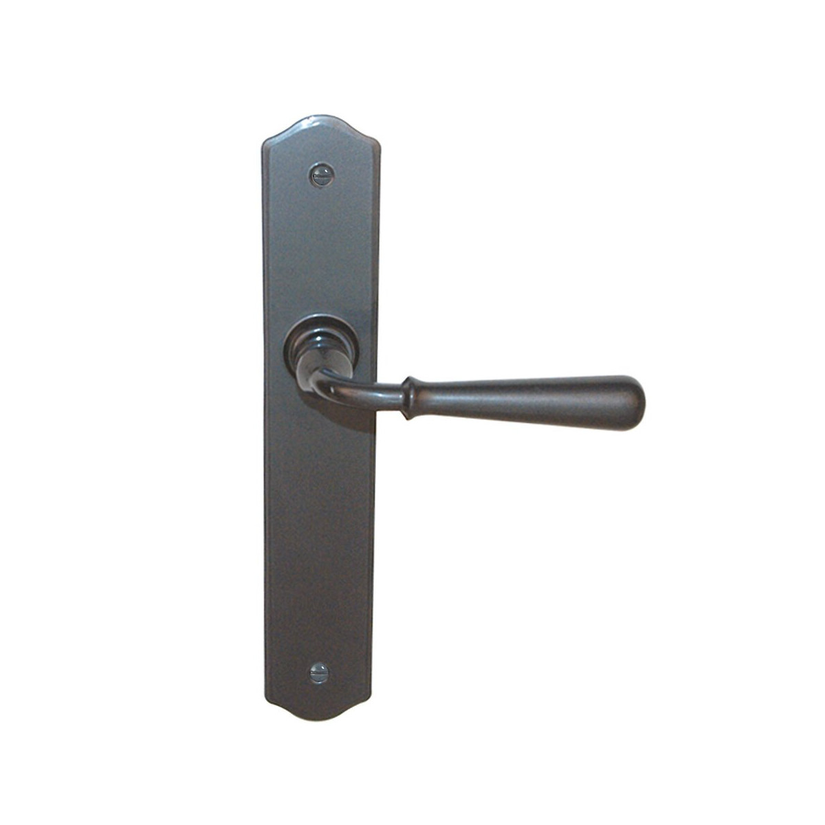 Ensemble de poignées Chinon en zamak à Bec de Cane sur plaques en acier. Décor fer. Saillie : 45 mm. Visserie fournie. Dimensions : Carré 7 mm / Entraxe 195 mm.Spécifications techniques