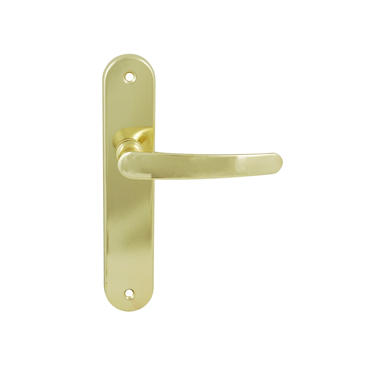 Ensemble de poignées Ludon en zamak à Bec de Cane sur plaques en acier. Coloris : laitonné. Visserie fournie. Dimensions : Carré 7 mm / Entraxe 165 mm.Spécifications techniques