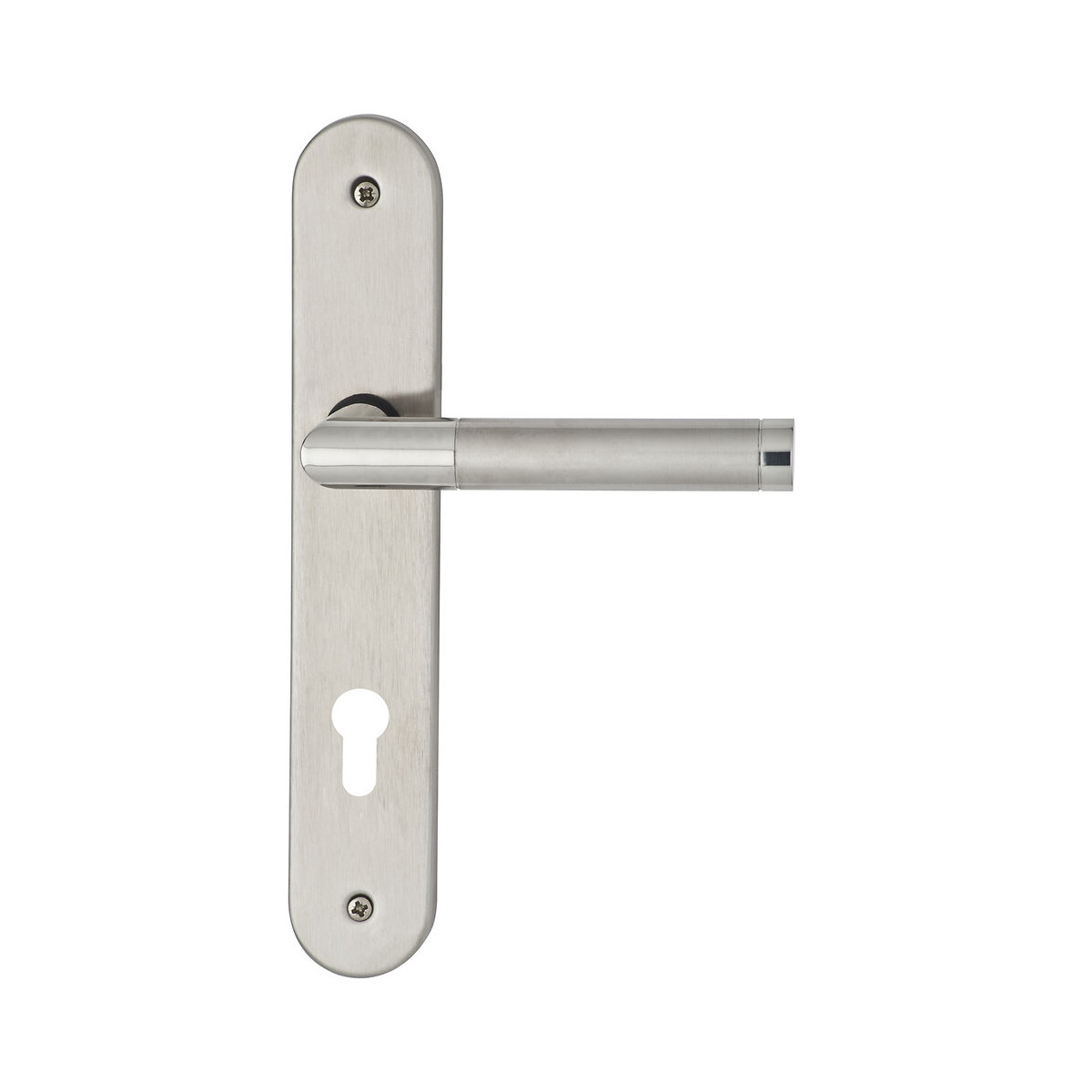 Poignée de porte Jessica en inox brillant satiné. Garniture sur plaque à perçage cylindre. Sans ressort de rappel. Entraxe béquille/serrure standard. Entraxe de fixation 195 mm. Épaisseur de la porte : 36 mm à 42 mm. Visserie fournie. Dimensions : Longueur 14,8 cm x Profondeur 7 cm x Hauteur 23,5 cm.