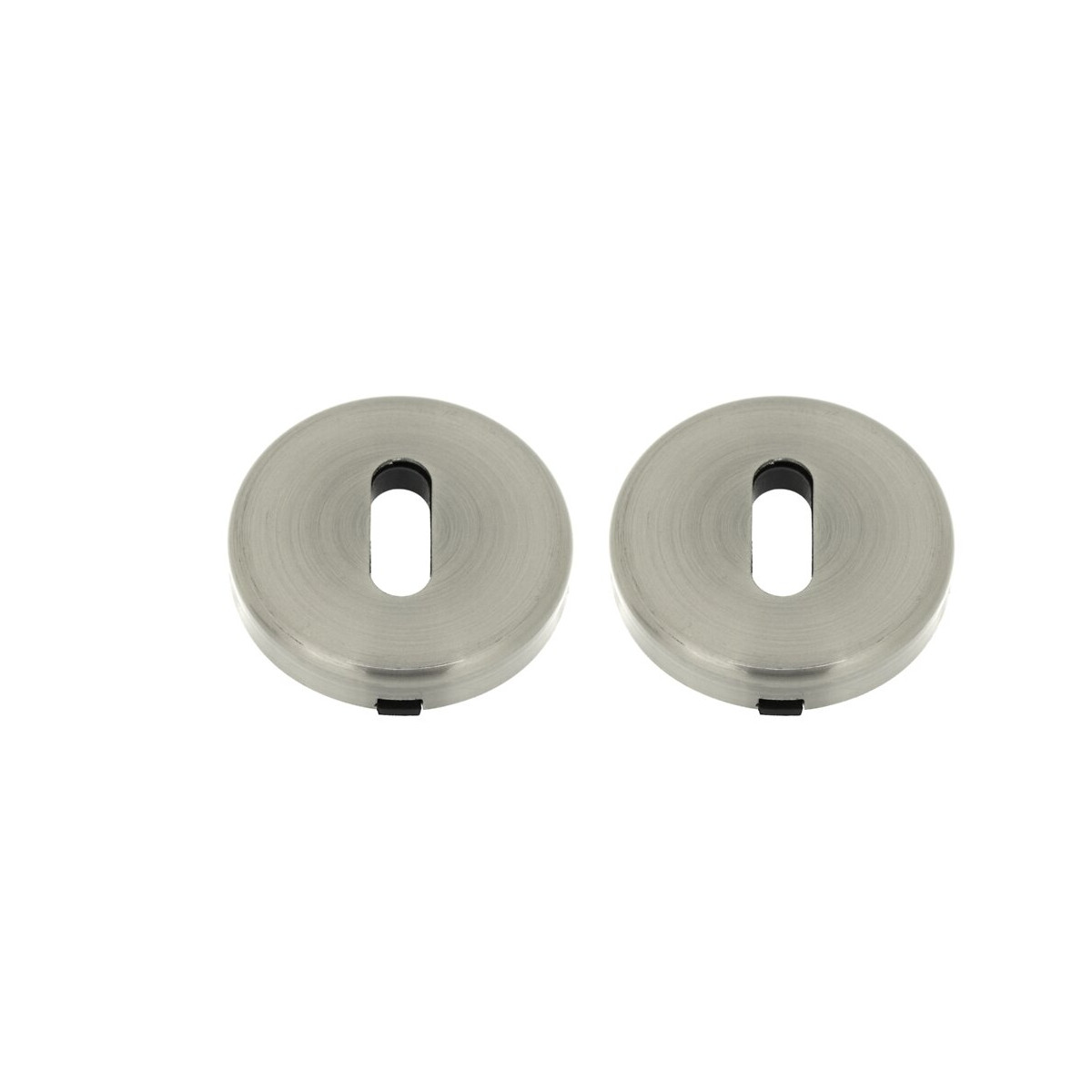 Paire de rosaces en laiton finition nickel mat à trou de clé. Fixation vis à bois fournie. Dimension : Diamètre 50 mm.Spécifications techniques