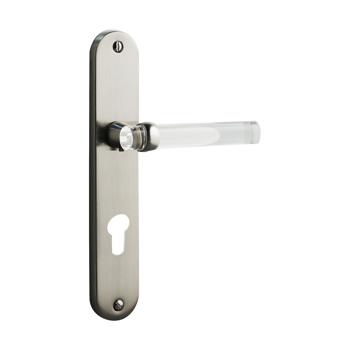 Poignée de porte Gum en acier finition nickel mat translucide. Garniture sur plaque à perçage cylindre. Sans ressort de rappel. Entraxe béquille/serrure standard. Entraxe de fixation 195 mm. Épaisseur de la porte : 36 mm à 42 mm. Visserie fournie. Dimensions : Longueur 13,1 cm x Profondeur 5,7 cm x Hauteur 22 cm.