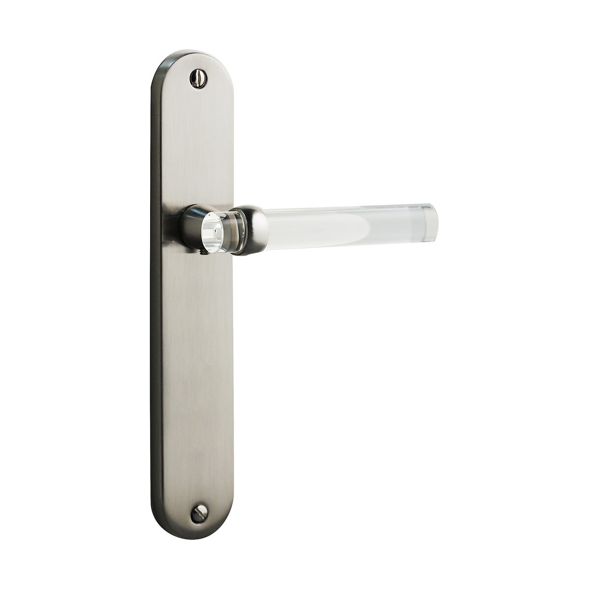 Poignée de porte Gum en acier finition nickel mat translucide. Garniture sur plaque à bec de cane. Avec ressort de rappel. Entraxe de fixation 195 mm. Épaisseur de la porte : 36 mm à 42 mm. Visserie fournie. Dimensions : Longueur 13,1 cm x Profondeur 5,7 cm x Hauteur 22 cm.