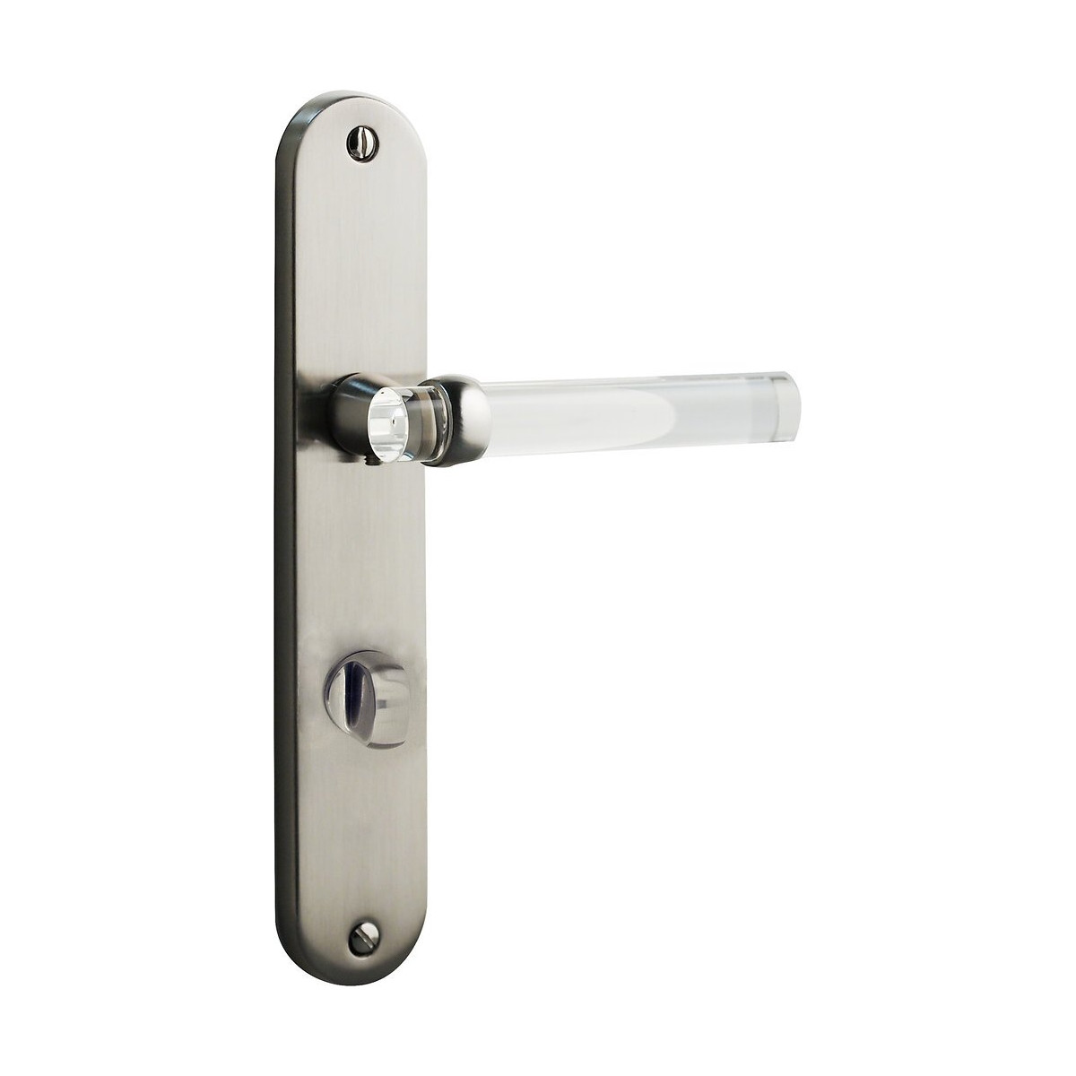 Poignée de porte Gum en acier finition nickel mat translucide. Garniture sur plaque à condamnation/décondamnation. Avec ressort de rappel. Entraxe béquille/serrure standard. Entraxe de fixation 195 mm. Épaisseur de la porte : 36 mm à 42 mm. Visserie fournie. Dimensions : Longueur 13,1 cm x Profondeur 5,7 cm x Hauteur 22 cm.