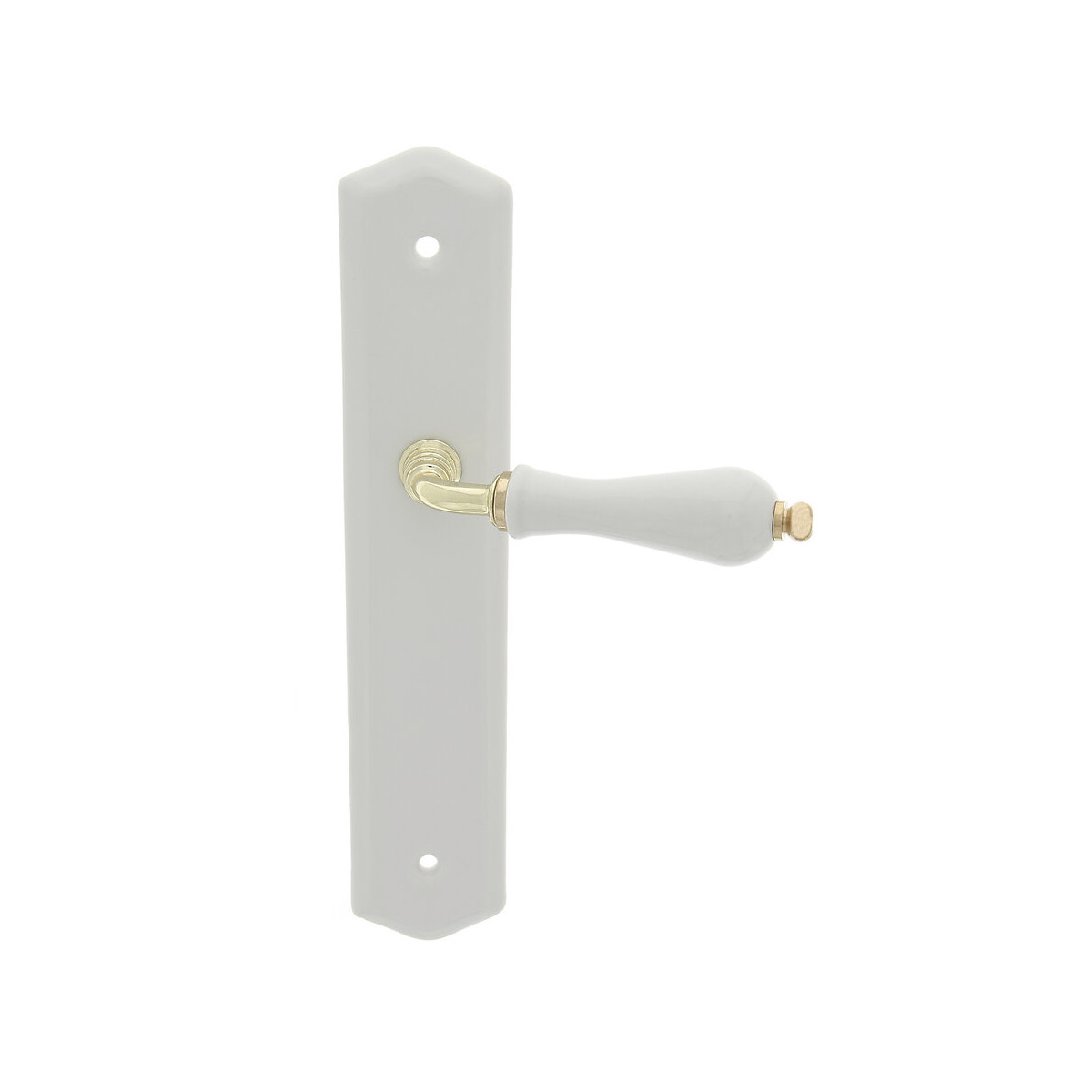 Ensemble de poignées Polon en porcelaine à Bec de Cane sur plaques. Coloris : blanc et doré. Saillie : 25 mm. Visserie fournie. Dimensions : Carré 7 mm / Entraxe 195 mm.Spécifications techniques