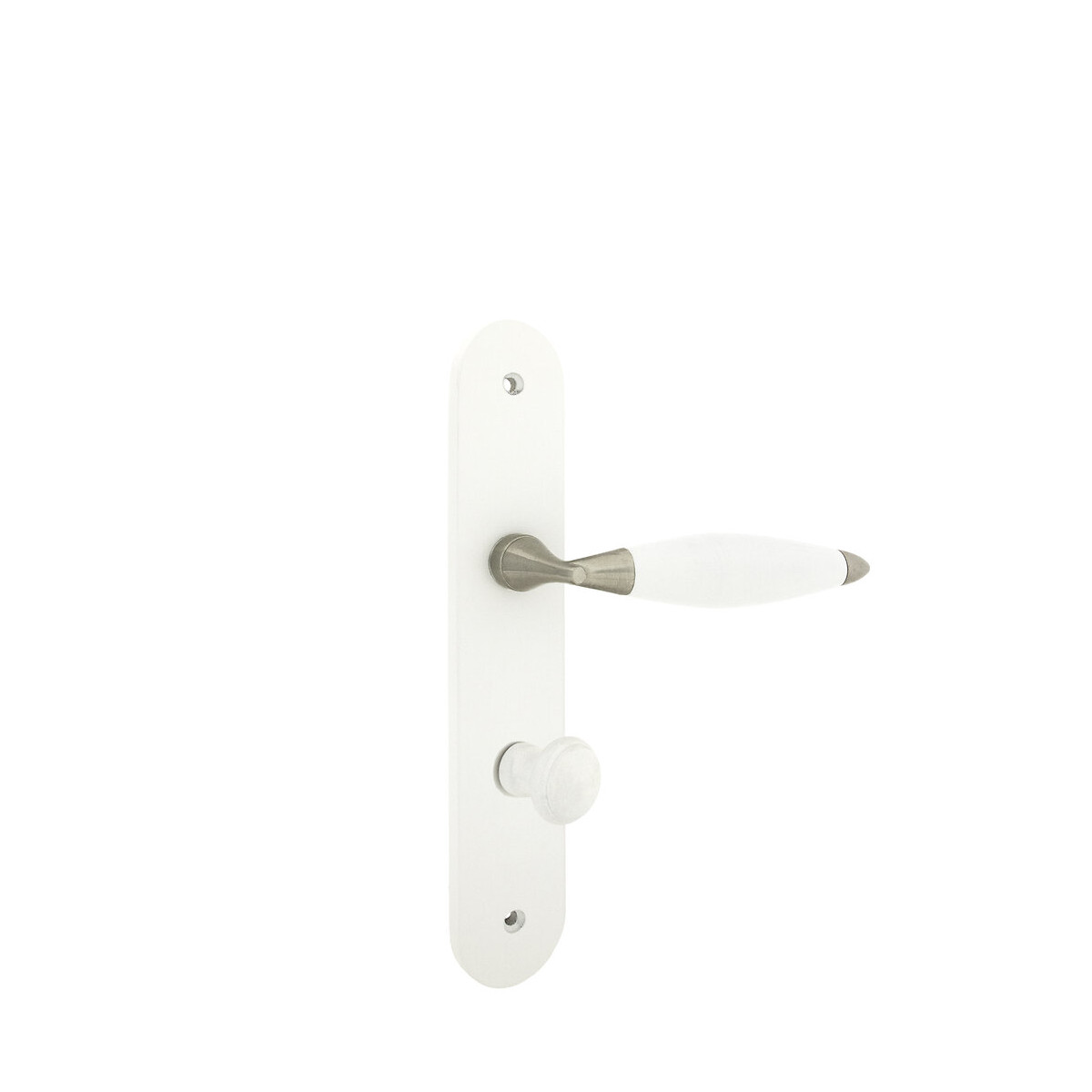 Paire de poignées sur plaque Athena en bois blanc et coude gris nickel mat condamnation. Entraxe de fixation 195mm. Visserie fournie.Spécifications techniques