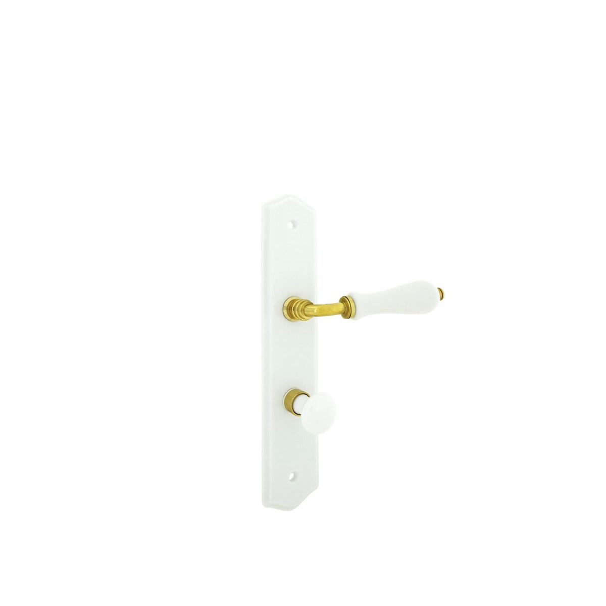 Poignée de porte POIRE sur plaque en porcelaine blanche. Coude doré. Décondamnation. Entraxe de fixation 195mm. Visserie fournie.Spécifications techniques
