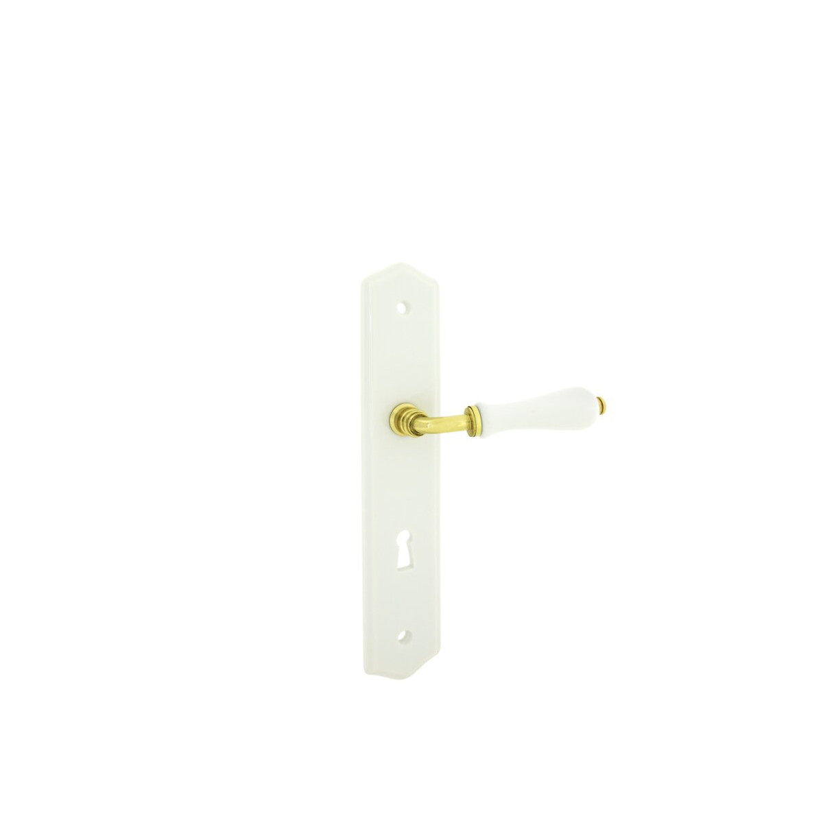 Poignée de porte POIRE sur plaque en porcelaine blanche. Coude doré. Trou de clé. Entraxe de fixation 195mm. Visserie fournie.Spécifications techniques
