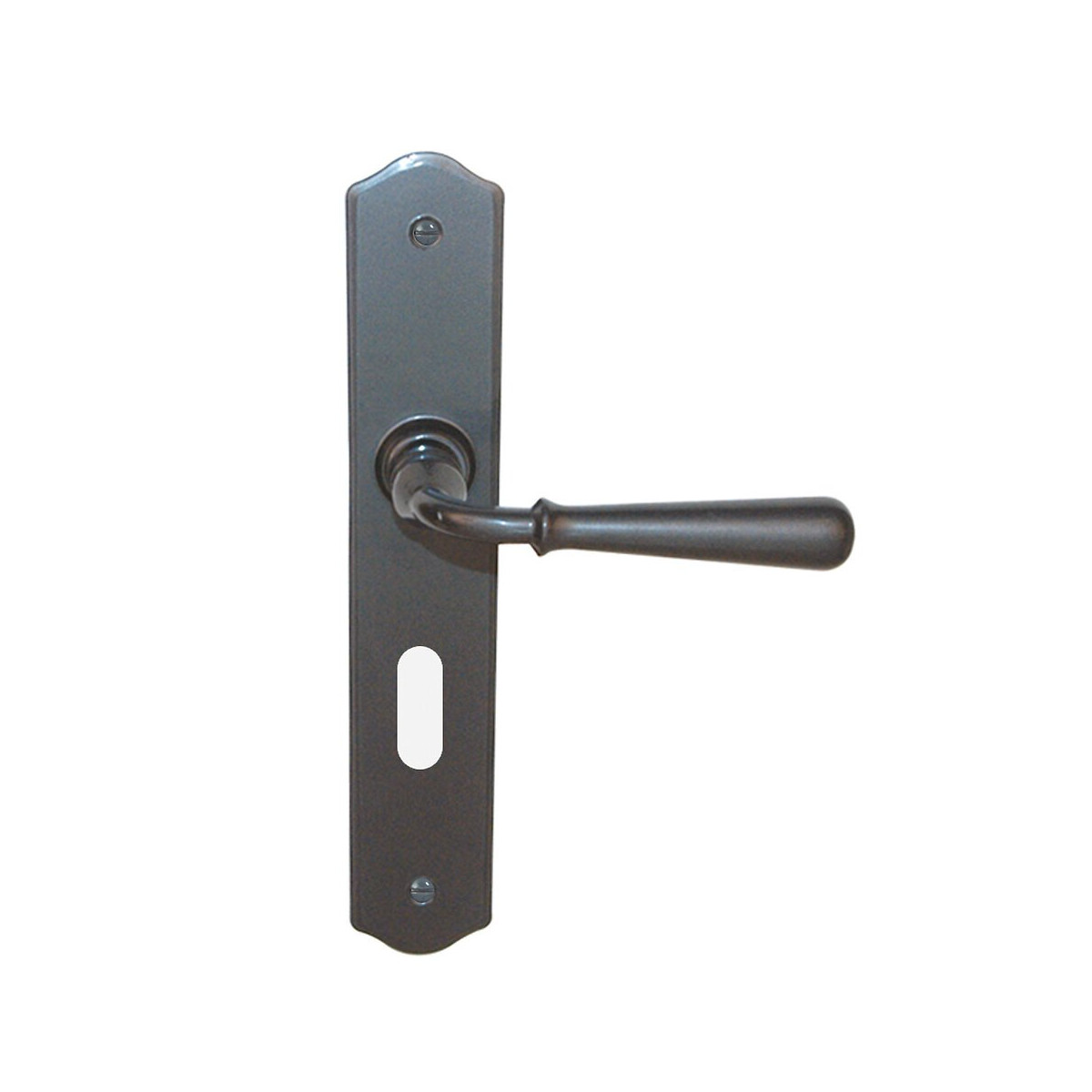 Ensemble de poignées Chinon en zamak à trou de clé sur plaques en acier. Coloris : décor fer. Saillie : 45 mm. Visserie fournie. Dimensions : Carré 7 mm / Entraxe 195 mm.Spécifications techniques