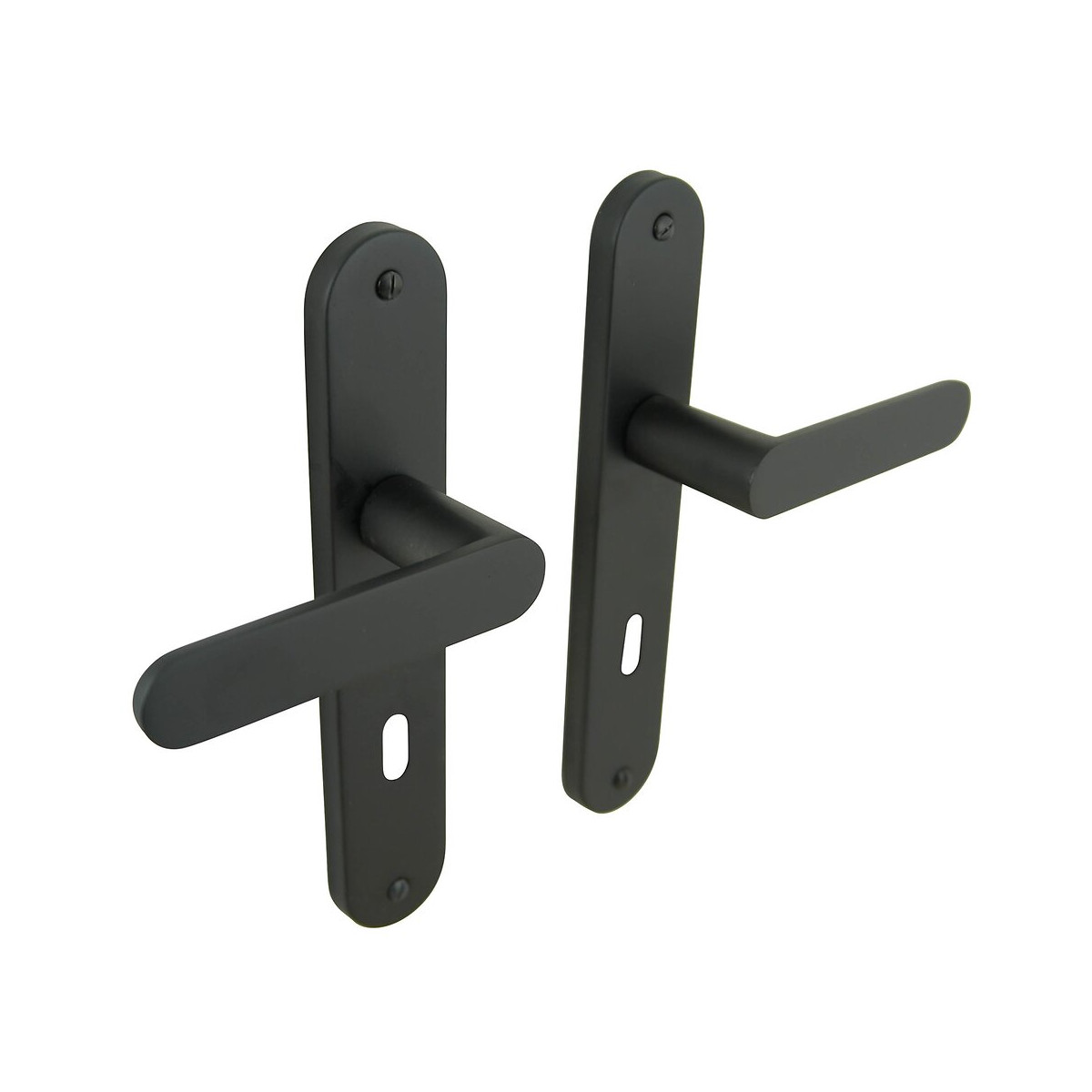 Ensemble poignée aluminium / plaques acier clé Meudon noir mat. Visserie fournie. Dimensions : Carré 7 mm / Entraxe 195 mm.Spécifications techniques