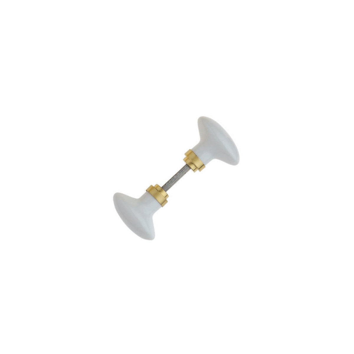 Paire de poignées de porte ovales en porcelaine blanche. Support en laiton doré. Compatible avec des serrures équipées d'un carré de 6 ou 7mm. Accessoires fournis.Spécifications techniques