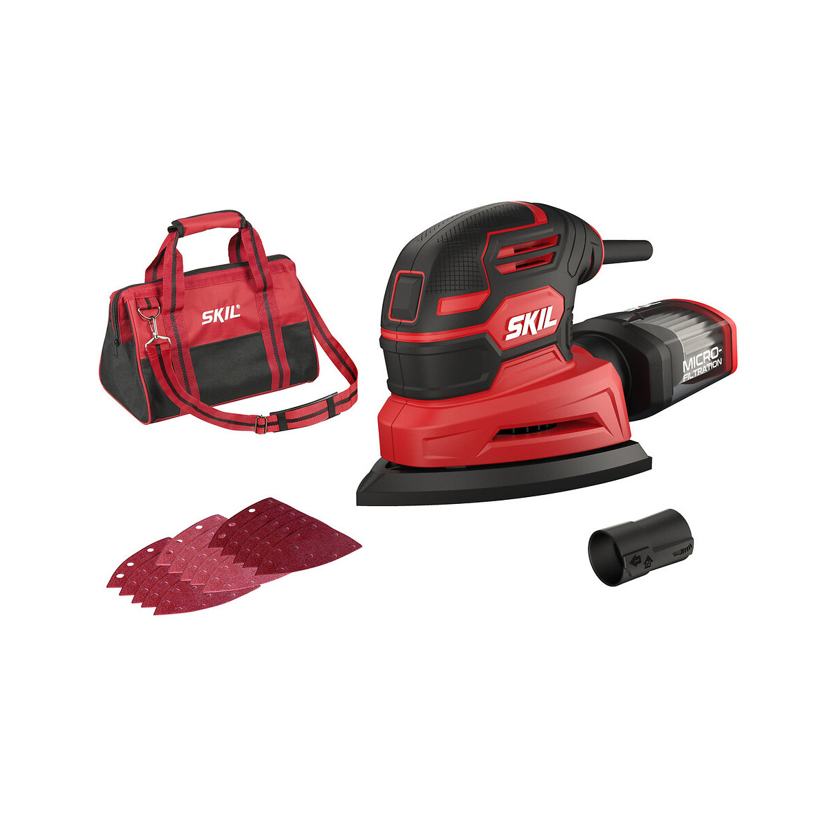 Ponceuse Multi polyvalente pour maniement aisé d’une seule main La SKIL 7260 est une ponceuse Multi compacte de 100 W avec base de ponçage multiforme conçue pour le ponçage de grandes surfaces et pour le ponçage dans les endroits difficiles d’accès, par exemple dans les coins et sur les bords de meubles et de fenêtres. À la fois légère et ergonomique, elle est idéale pour une utilisation d’une seule main et à la verticale. Pour un travail plus propre, elle intègre un système d’aspiration des poussières. Son système microfiltre retient même les particules de poussière les plus fines. L’adaptateur pour aspirateur fourni permet aussi de raccorder un aspirateur si vous le souhaitez. Le logement des roulements à billes de haute qualité, étanches à la poussière, empêche toute pénétration de poussière dans les composants intérieurs sensibles, ce qui allonge la durée de vie de l’outil. Qui plus est, la poignée bi-matière de l’outil améliore le confort d’utilisation. La ponceuse SKIL 7260 DA est fournie dans un sac de transport avec 15 abrasifs à fixation pour feuilles auto-agrippantes, un boîtier à poussière et un adaptateur pour aspirateur. Puissance absorbée : 100 W Surface de ponçage totale : 151 x 102 mm Mouvements de ponçage : 24000 /min Ø mouvement excentrique : 1,6 mm Fixation pour feuilles auto-agrippantesSpécifications techniques