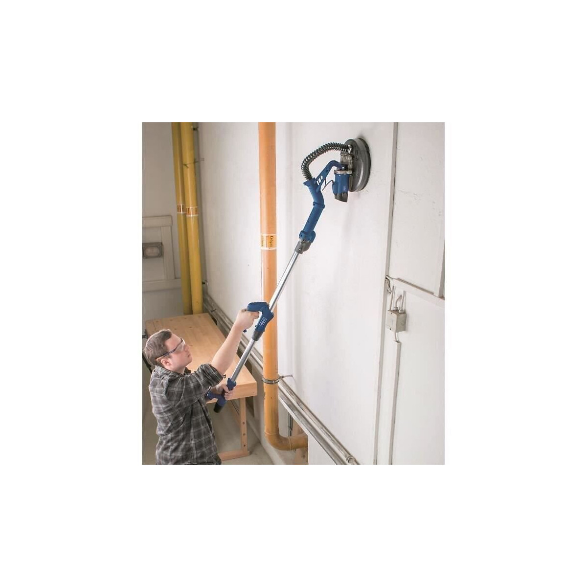 Ponceuse a plâtre avec bras télescopique pliable 710 w. Moteur : 230 V. Puissance: 710 W. Vitesse : 700- 1700 tr / min. Diametre meule : 225 mm. Bouche d'aspiration Ø interieur / extérieur : 45 mm / 50 mm. Facile et efficace, cette ponceuse enleve les enduits, plaques de plâtres et que les résidus de papiers peint. Nouvelle poignée ergonomique plus maniable. Démontable (transport et rangement facile).