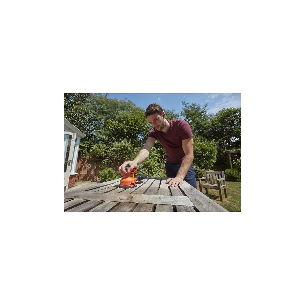 PONCEUSE EXCENTRIQUE 230 WATTS Revetement grip anti-dérapant, position confortable a l'horizontal et a la verticale, 1 vitesse 13 000 orbites/min, taille du plateau 125mm, diametre de l'orbite 3mm. Livrée avec un sac de collection des poussieres et 1 abrasif