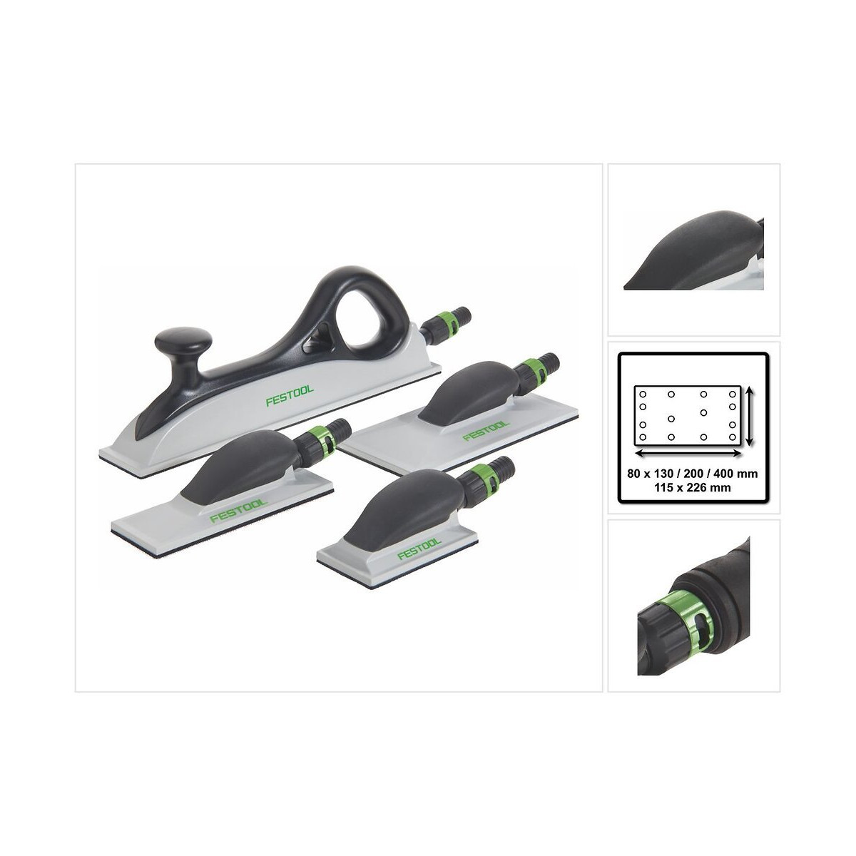 Contenu du paquet : - 1x Cale de ponçage Festool HSK-A 80x130 - 1x Cale de ponçage Festool HSK-A 80x200 - 1x Cale de ponçage Festool HSK-A 80x400 - 1x Cale de ponçage Festool HSK-A 115x226 - 4x Adaptateurs pour tuyau Festool - 4x Adaptateurs Festool bypass Description du produit: Le set de cales de ponçage HSK-A-Set de Festool comprend quatre cales de ponçage pour différentes applications. Leurs bandes abrasives Festool StickFix de 80 x 133 mm, 80 x 400 mm et 115 x 228 mm sont très maniables. Chacune d'elle est équipée d'un dispositif lui permettant d'aspirer directement les poussières de ponçage à l'aide des adaptateurs pour tuyau Festool standard. Les adaptateurs bypass inclus permettent un réglage continu de sa puissance d'aspiration. Ces cales de ponçage sont parfaites pour le ponçage manuel des surfaces ou d'arrondis. Grâce à leurs dispositifs d'aspiration, il est également possible de réaliser des travaux de ponçage prolongés. En résumé : ces cales de ponçage sont conçues pour tous les travaux de ponçage, du ponçage dégrossissant au ponçage intermédiaire en passant par le ponçage de finition. Festool est un fabricant d'outils électriques dont la réputation n'est plus à démontrer et qui se distingue par ses hauts standards de qualité. Spécifications techniques : Fabricant : Festool Numéro du fabricant : 497101 Désignation du fabricant : HSK-A-Set Dimensions : 80 x 400 mm / 80 x 200 mm / 80 x 130 mm / 115 x 226 mm Compatibilité : Bandes abrasives Festool STF 80x400 / STF 80x133 / STF 115x228