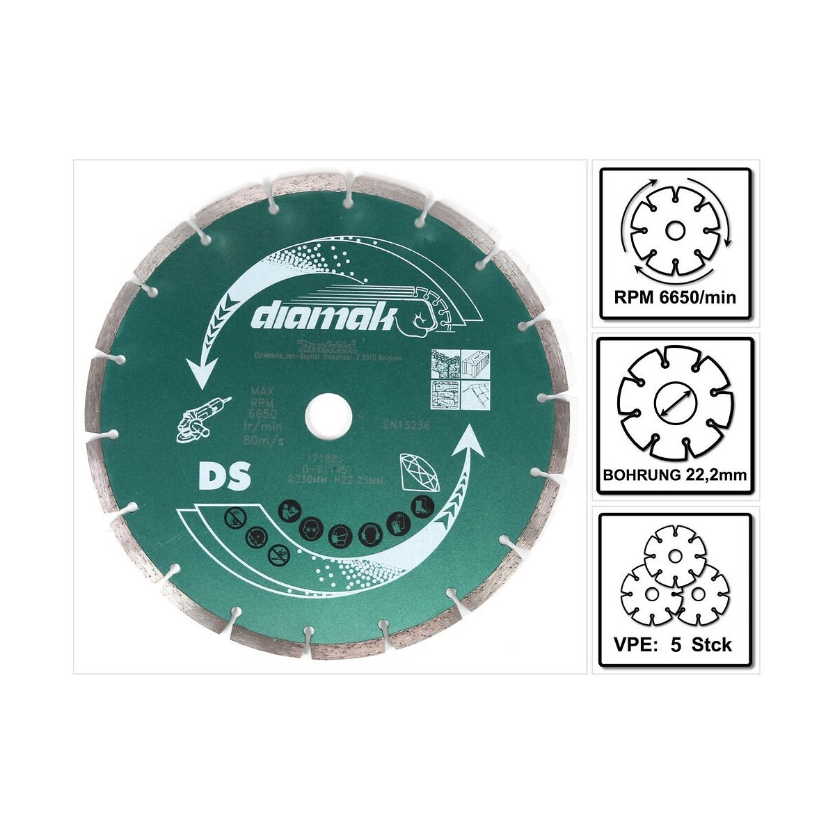 Contenu du paquet: - 5x Makita Diamak 230 mm. ( D-61145 ) Disque Diamant à tronçonner pour Pierre, beton, ardoise, briques, tuiles 22,23 mm Description du produit: Le disque de diamant Makita Diamak est parfait pour une utilisation avec votre meuleuse d'angle sur le béton, la brique tendre, le marbre, l'ardoise, les carreaux de ciment et les matériaux de chantier. Spécifications techniques: Diamètre: 230 mm Diamètre de l'alésage: 22,23 mm Hauteur de segment: 7 mm Vitesse Max.de rotation: 6650 tr/Min Progression de coupe: 80 m/s (4.800 m/min) Applications: Pierre, béton