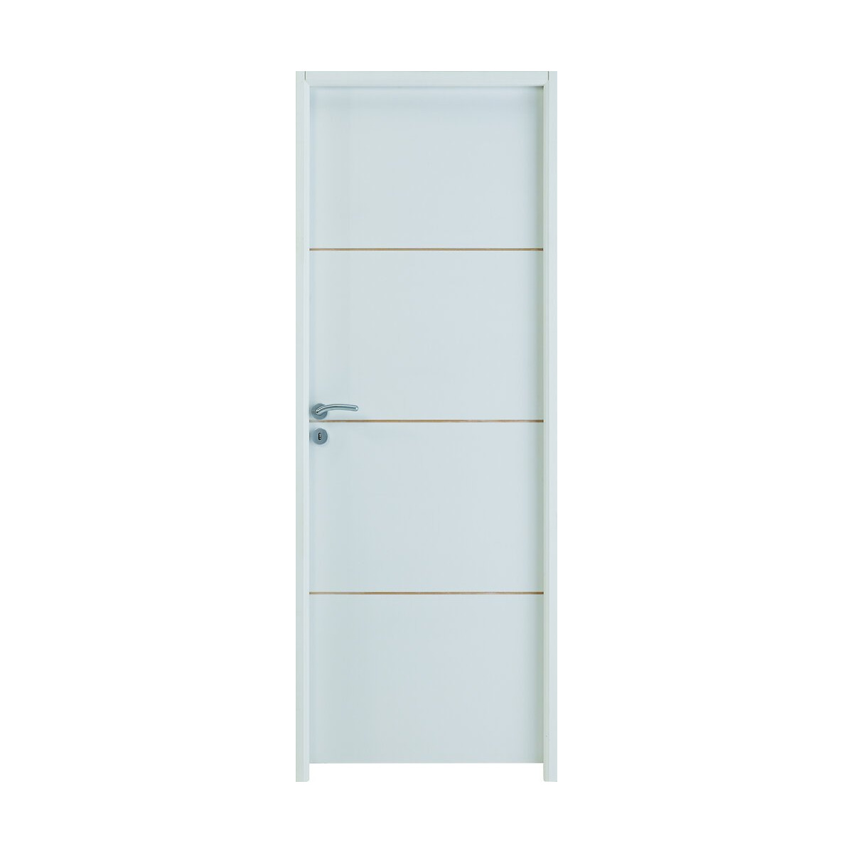 Bloc-porte âme alvéolaire. Remplissage nid d'abeille. Vantail à recouvrement d'une épaisseur de 39 mm avec faces MDF (medium density fiberboard) recouvertes d'une pré-peinture blanche. Chants bruts laissant apparaitre les deux panneaux MDF et l'alaise en sapin. Dormant : huisserie en MDF contrecollé enrobée d'un plaquage décor prépeint blanc. Joint de frappe périphérique blanc monté. Motif réalisé sur les deux faces de la porte à partir de rainures découvrant la fibre brune du panneau MDF. Ferrage par fiches à broches bichromaté diamètre 13mm. De base serrure à clé (condamnation en option). Ouverture de la porte : poussant droit. Nécessite une reprise de finition par le client. Existe en version acoustique, thermique et huisseries fin de chantier. Dimensions : largeur 73 cm - hauteur 204 cm - huisserie : 72mm.