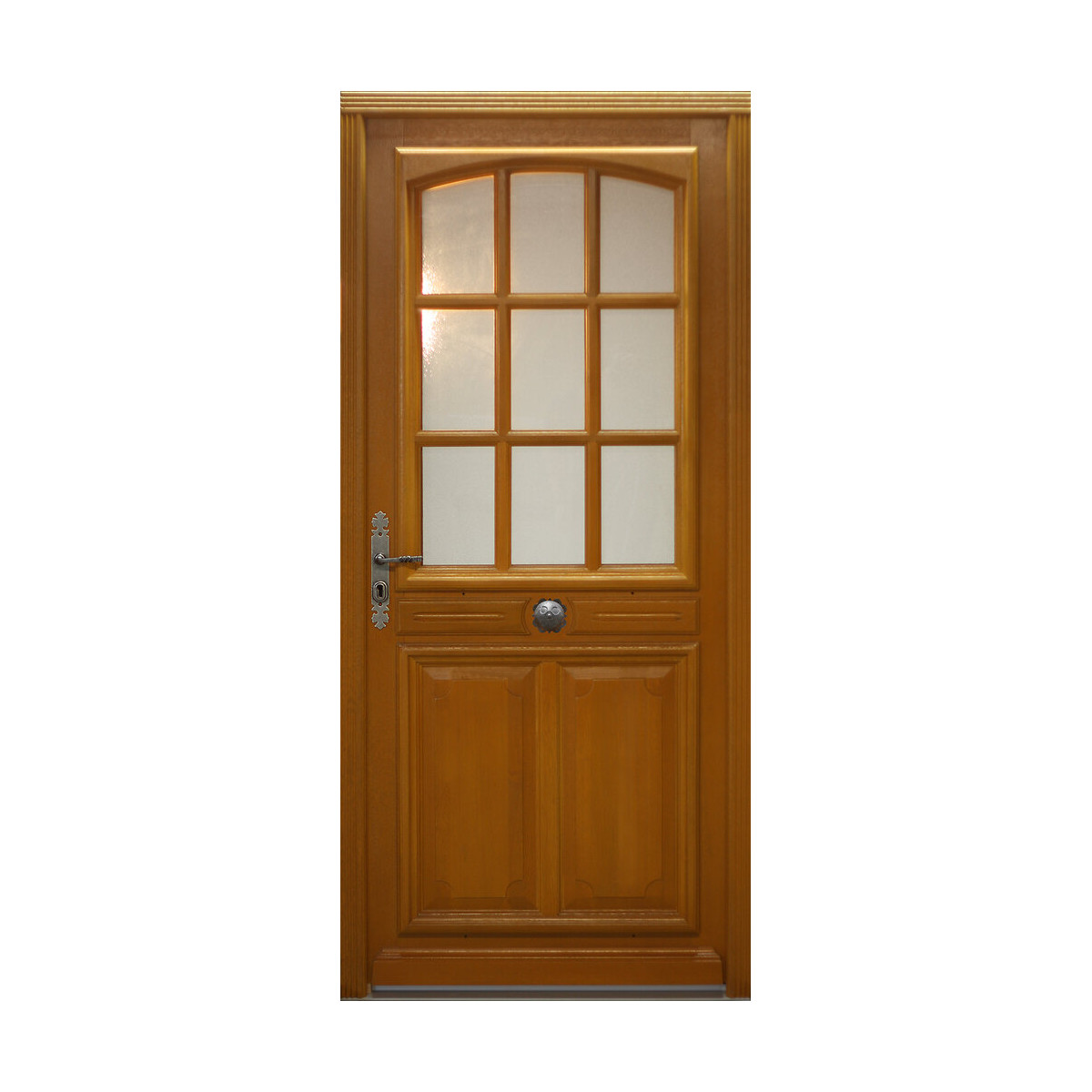 Porte d'entrée en bois exotique méranti, crémone 6 points, seuil aluminium anodisé dormant 46mm.