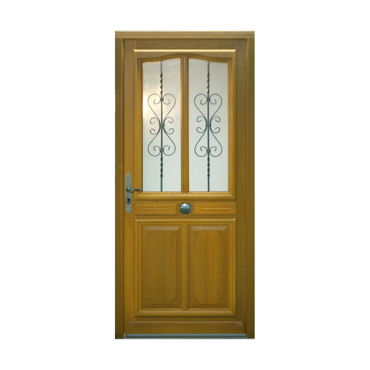 Porte d'entrée en bois exotique méranti, crémone 6 points, seuil aluminium anodisé dormant 46mm.