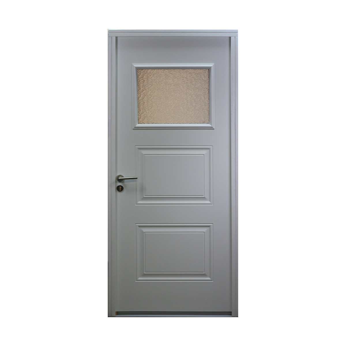 Portes d'épaisseur 46mm ouvrant et dormant, Porte acier 75/100 anticorrosion G40. Crémone à relevage de marque VACHETTE comprenant 6 points de fermeture, seuil aluminium anodisé dormant 46mm.