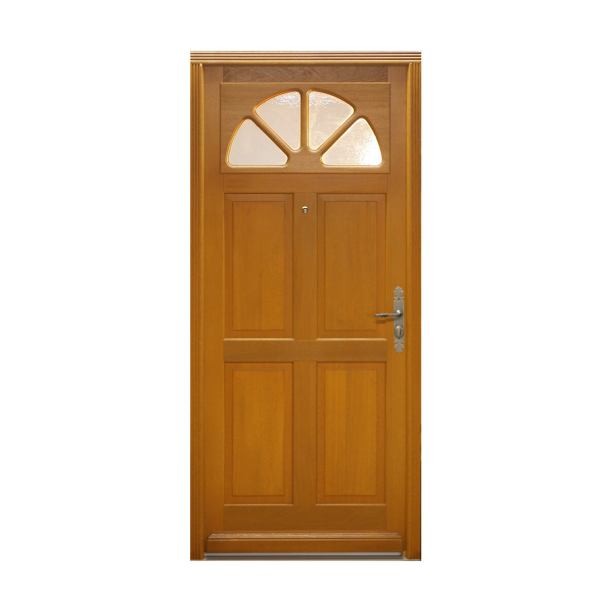Porte d'entrée en bois exotique méranti, crémone 6 points, seuil aluminium anodisé dormant 46mm.