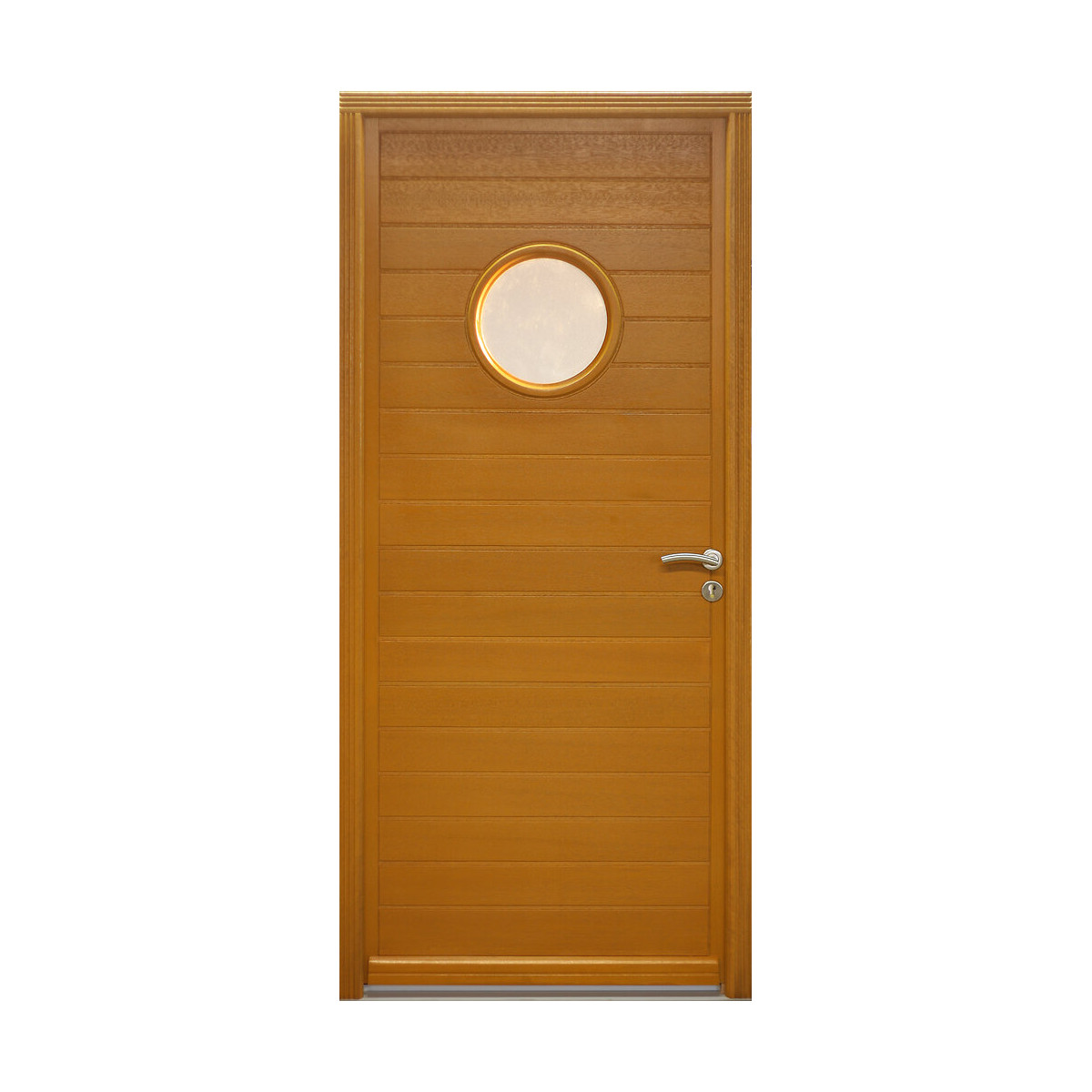 Porte d'entrée en bois exotique méranti, crémone 6 points, seuil aluminium anodisé dormant 46mm.