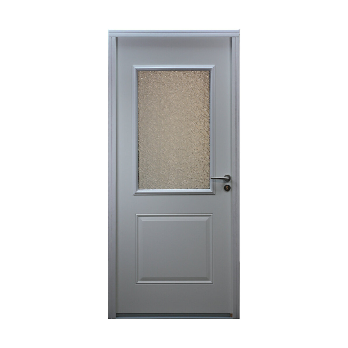 Portes d'épaisseur 46mm ouvrant et dormant, Porte acier 75/100 anticorrosion G40. Crémone à relevage de marque VACHETTE comprenant 6 points de fermeture, seuil aluminium anodisé dormant 46mm.