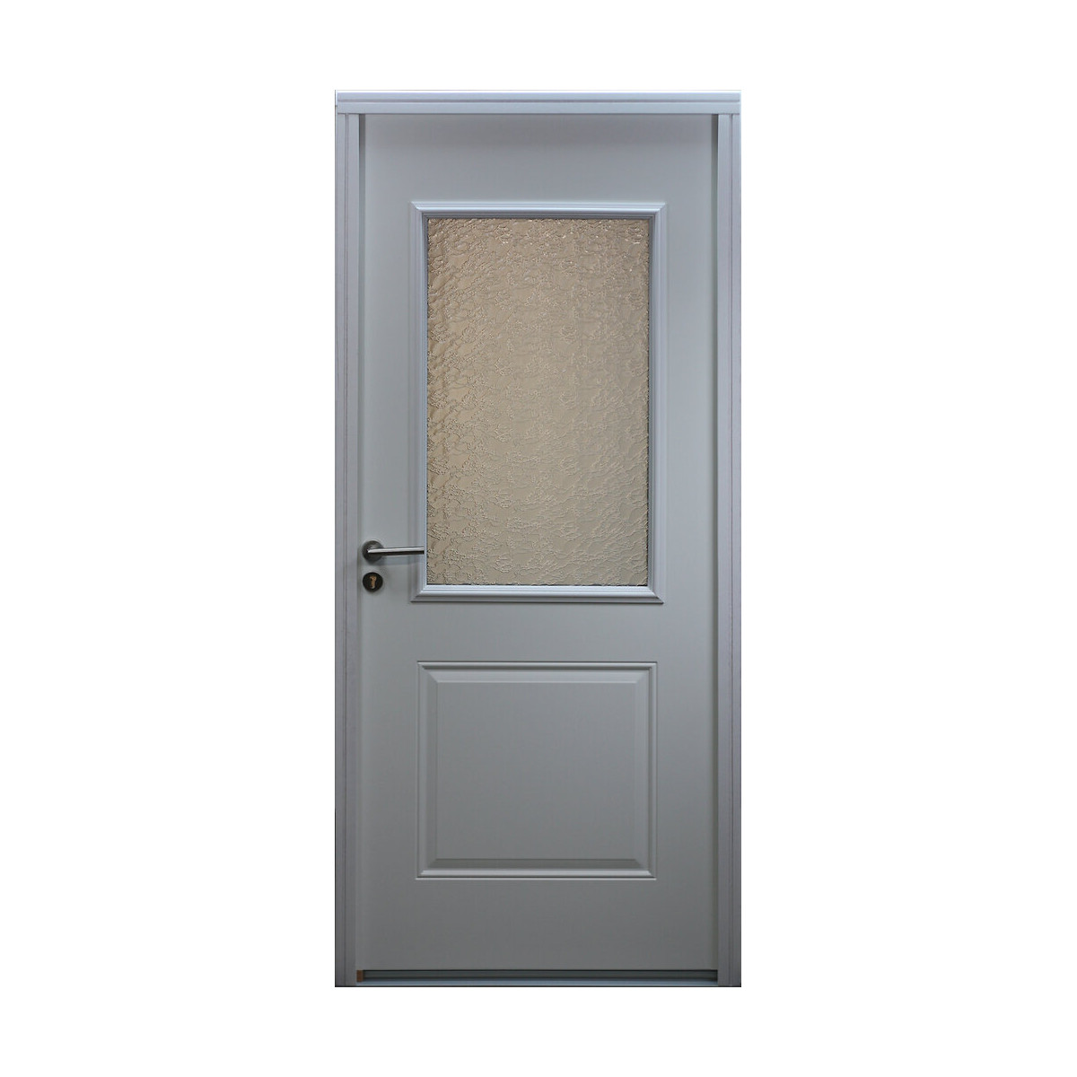 Portes d'épaisseur 46mm ouvrant et dormant, Porte acier 75/100 anticorrosion G40. Crémone à relevage de marque VACHETTE comprenant 6 points de fermeture, seuil aluminium anodisé dormant 46mm.
