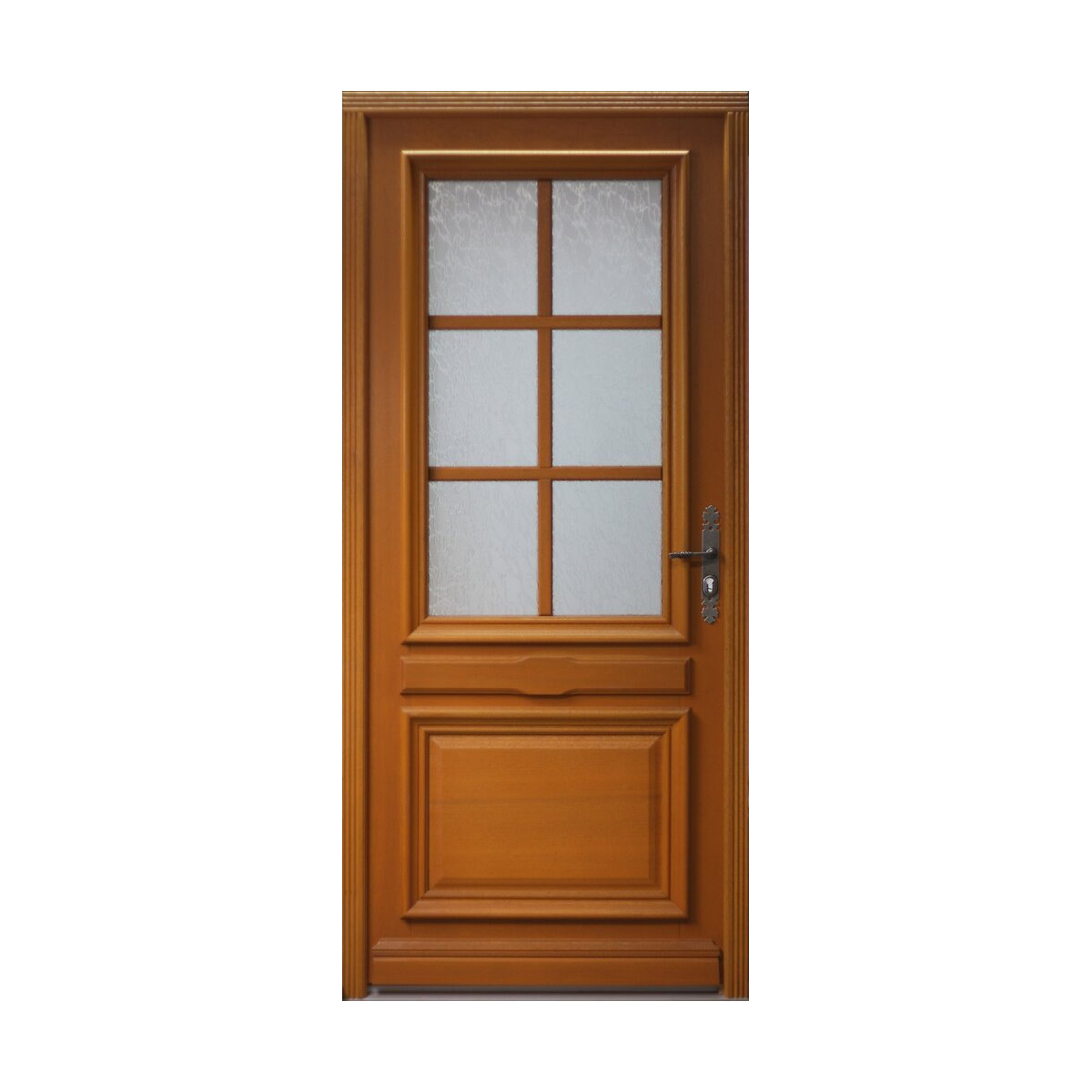 Porte d'entrée en bois exotique méranti, crémone 6 points, seuil aluminium anodisé dormant 46mm.