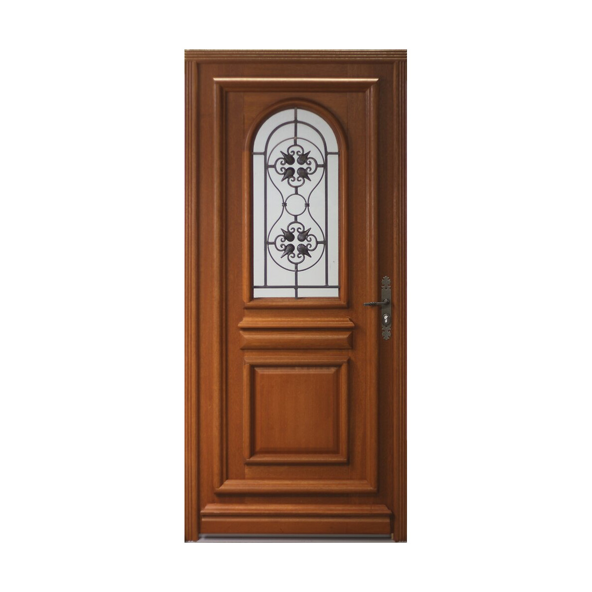 Porte d'entrée en bois exotique méranti, crémone 6 points, seuil aluminium anodisé dormant 46mm.