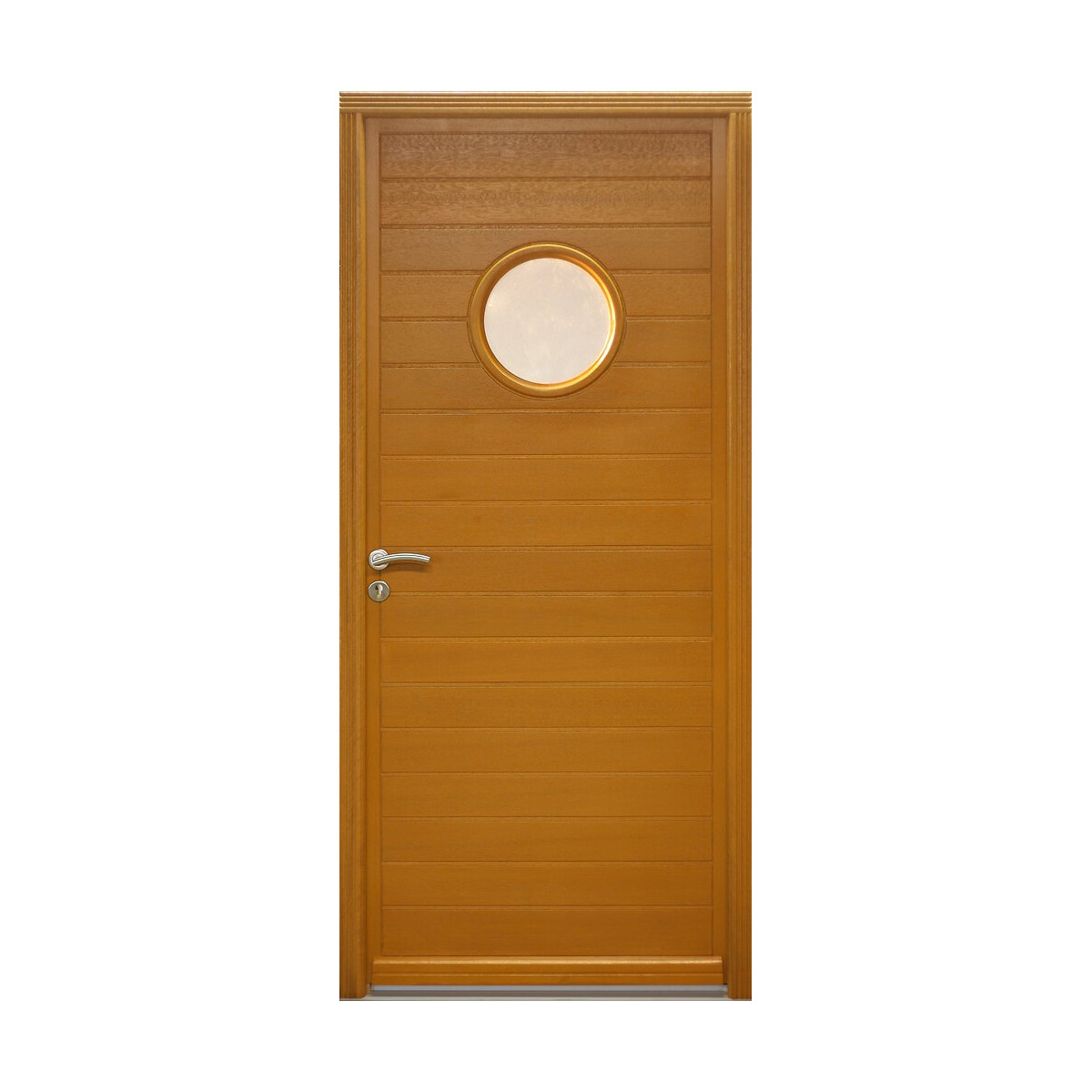 Porte d'entrée en bois exotique méranti, crémone 6 points, seuil aluminium anodisé dormant 46mm.