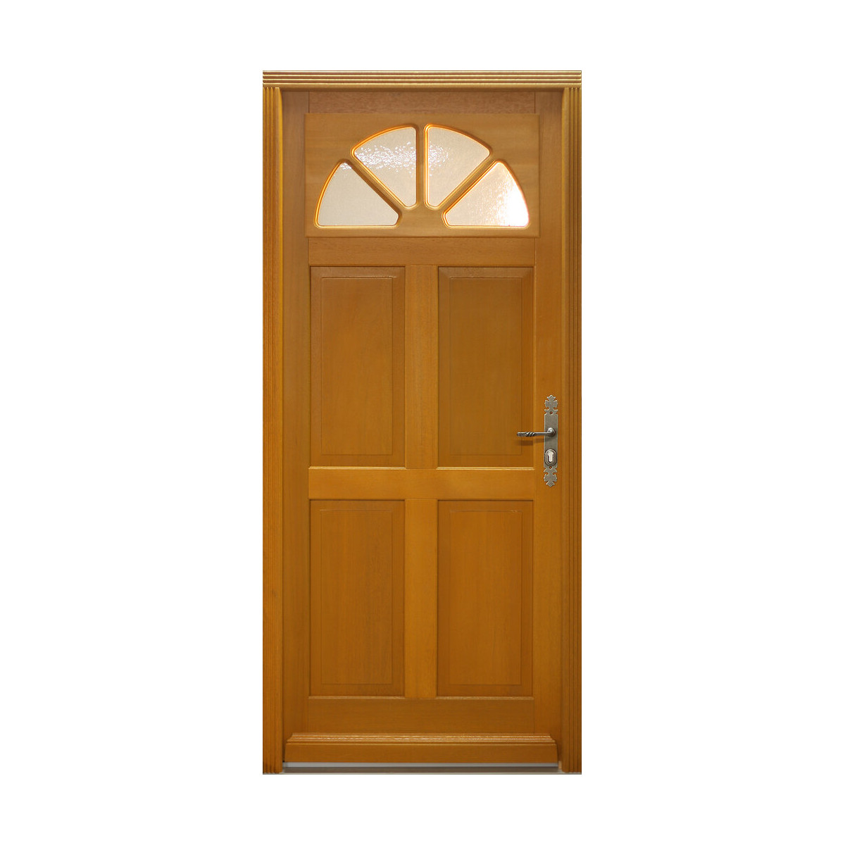 Porte d'entrée en bois exotique méranti, crémone 6 points, seuil aluminium anodisé dormant 46mm.