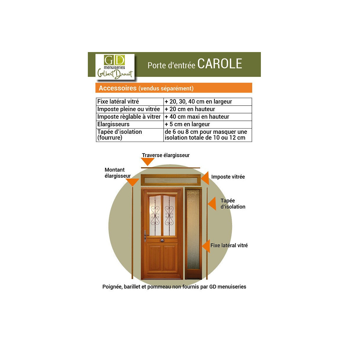 Porte d'entrée modèle "CAROLE" en bois Cote tableau : HAUTEUR 215 X LARGEUR 90 POUSSANT DROITE COTE HORS TOUT : H 219,6 x L 87,8 cm Vitrage 4/12/4 GRANIT POIGNEE ET BARILLET NON FOURNIS p> Dormant et ouvrant de 46mm d'épaisseur; Crémone 6 points Assa Abloy (Vachette) 4 fiches réglables sans dégondage de la porte et 5 gâches réglables Seuil alu anodisé : hauteur du seuil et ouverture adaptées aux personnes à mobilité réduite Ces menuiseries reçoivent en usine un traitement FIH: Fongicide, Insecticide, Hydrofuge, contre champignons, moisissures, insectes xylophages et humidité ce premier traitement doit recevoir obligatoirement 2 couches de finition après la pose pour assurer une bonne protection. Faire par la suite un entretien régulier Vous pourrez également peindre votre porte de la couleur de votre choix pour l'assortir à votre maison. Le Groupe de GD Menuiseries adhère à PLANETE URGENCE et participe à l'opération 1€ = 1 arbre planté