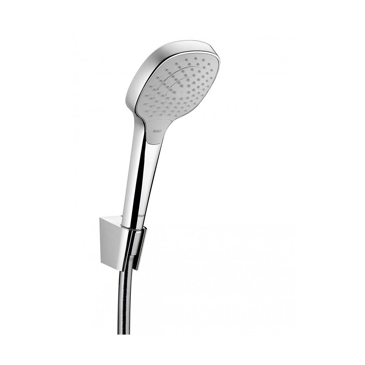 Le trio pommeau de douche, flexible et support mural My Select E Vario Hansgrohe possède une douchette au jet enveloppant et généreux, parfaitement réparti sur ses 11 cm de diamètre. Elle propose 3 jets : Rain, IntenseRain et TurboRain. Vous changez de jet très facilement par la simple pression du bouton Select, pour une manipulation rapide et confortable. Anticalcaire, les jets sont toujours irréprochables et pour longtemps. L'élimination du calcaire se fait par un simple passage du doigt sur les picots. Un mécanisme robuste et durable, qui vous permettra de profiter de tous les jets du pommeau de douche. Facile d'entretien, le chrome d'excellente qualité assure une brillance durable. En plus, l'ergonomie de la poignée a été étudiée pour vos gestes sous la douche : même les mains mouillées, la prise en main est naturelle et confortable. Garantie 5 ans. Produit composé de: Pommeau, flexible et support mural Support mural douchette: 1 position Matière du pommeau: ABS Nombre de jets: 3 Type de jet: Pluie Dimension de la douchette (en cm): 11 Borne longueur du flexible (en m): 1.5 Matière du flexible: Plastique renforcé Economie d'eau: Non Consommation d'eau jet pluie à 3 bars (en l/min): 16 Fonction éco-stop: Non Matière principale: ABS Connectable par une box: Non Nettoyage du calcaire du pommeau: Picots à base siliconée Norme ou label: ACS Système d'économie d'eau: Sans Produit emballé : hauteur (en cm): 30.3 Produit emballé : largeur (en cm): 19.4 Produit emballé : profondeur (en cm): 9.1 Produit emballé : poids (en kg): 0.756