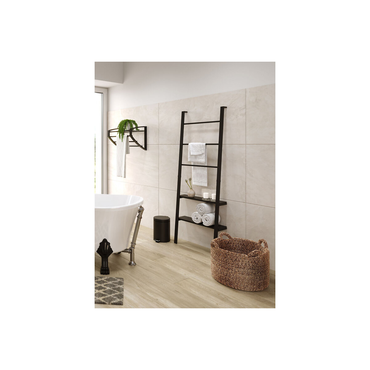 Échelle porte serviette en Métal à poser Noire Loft Game. Possibilité de fixer cette échelle au mur . Elle est composé de 3 barres et 2 étagères . Dimensions : 55.6x159x20 cm Poids : 5 Kg Couleur : Noir Vous pouvez facilement mettre de l'ordre en installant votre serviette sur l'une des trois barres et vos accessoires sur les étagères. Pour un meilleur maintien, vous avez la possibilité de fixer l'échelle au mur.