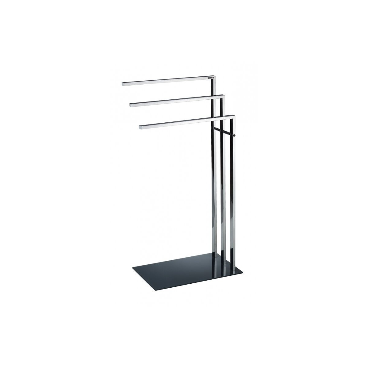 Porte-serviettes Verry 3 barres chrome brillant Hauteur adaptée pour des draps de bain de grande taille 3 barres rondes de diamètre 19 mm Dimensions : 90 x 37 x 28 cm Stable : socle de grande largeur avec des plots antidérapants dessous. Poids : 3.10 Kg Matériaux : Acier Chromé brillant (structure), Verre trempé (socle), plastique (plots antidérapants) Coloris : Acier (structure), gris anthracite (socle)Spécifications techniques