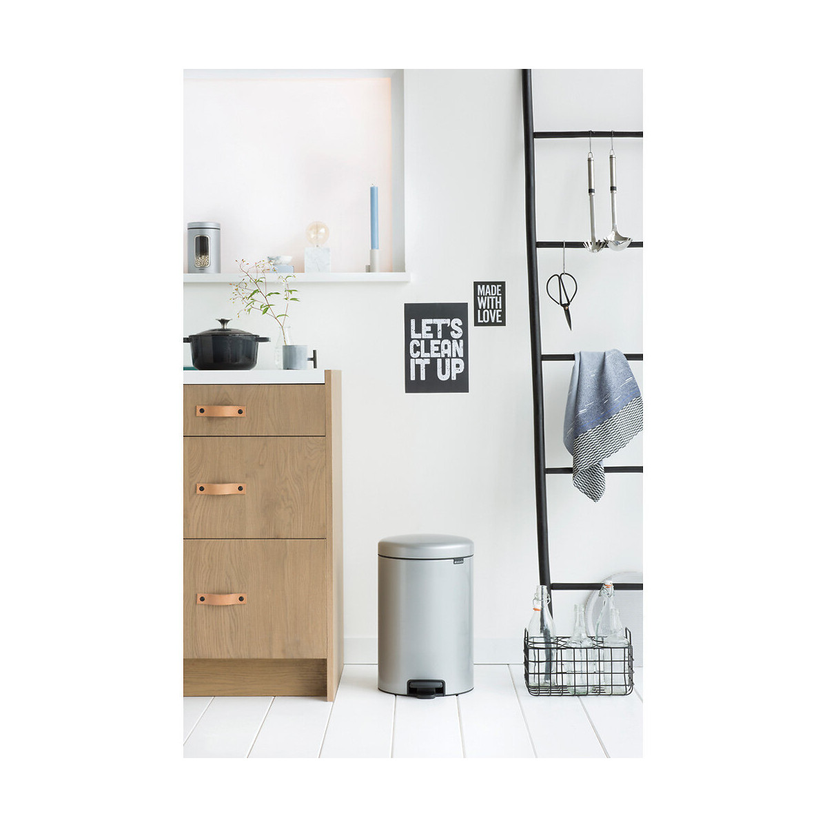 Poubelle à pédale NewIcon, 20 litres, Metallic Grey, fermeture douce, seau intérieur plastique. Garantie 10 ans, cette poubelle de 20 litres est idéale pour une utilisation dans la cuisine ou dans une pièce à vivre : grâce à sa large ouverture, vous déposez vos déchets sans risque d'en renverser. Les poubelles à pédale NewIcon ne sont pas seulement des beautés emblématiques, elles sont également des travailleurs fiables. Avec leur fonction unique de fermeture douce, leur couvercle se referme en silence et sans effort. Seau intérieur plastique. En achetant cette poubelle, vous soutenez The Ocean Cleanup à remplir sa mission - débarrasser les océans des déchets plastique. Pour chaque poubelle vendue, Brabantia verse une donation.Spécifications techniques