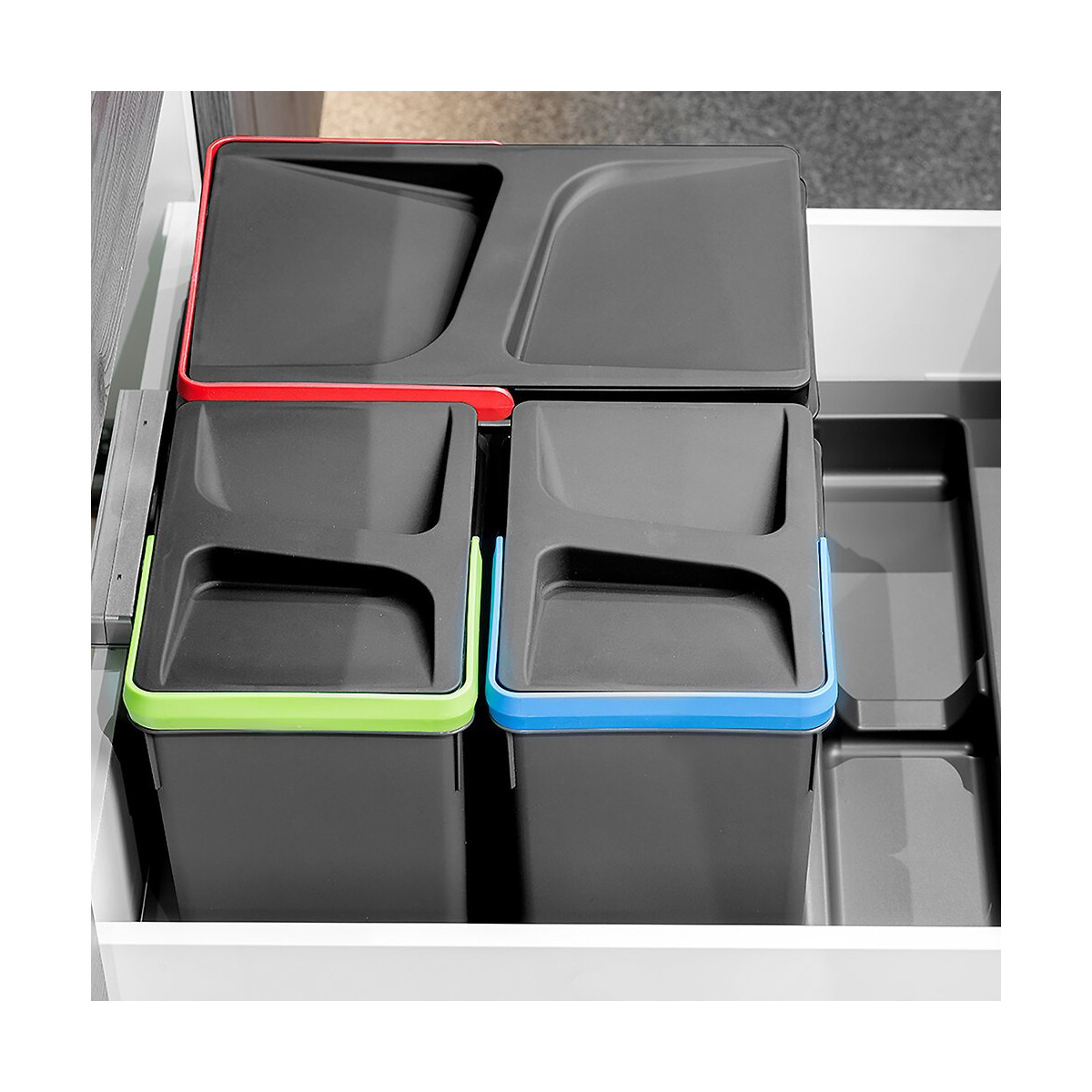 Les poubelles pour tiroir Recycle Emuca , intégrées dans les meubles de la cuisine, permettent de séparer plus facilement les déchets de façon discrète et organisée. Elles sont disponibles en deux hauteurs avec une capacité utile de 6 litres à 15 litres.Ces poubelles sont dotées d’une anse colorée afin de mieux identifier les déchets, ainsi que pour faciliter leur extraction, et donc leur vidage et nettoyage.Spécifications techniques