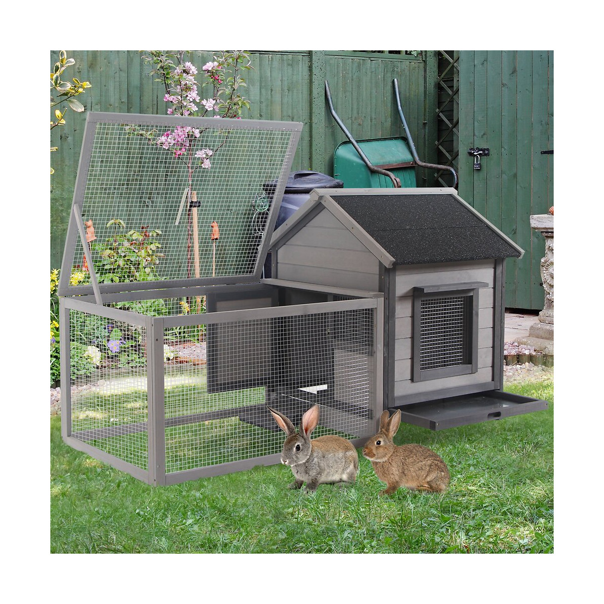 Clapier Cage À Lapin Cottage - Niche Avec Rampe, Porte, Fenêtres, Plateau Excrément Amovible - Toit Enclos Ouvrant - Bois Sa