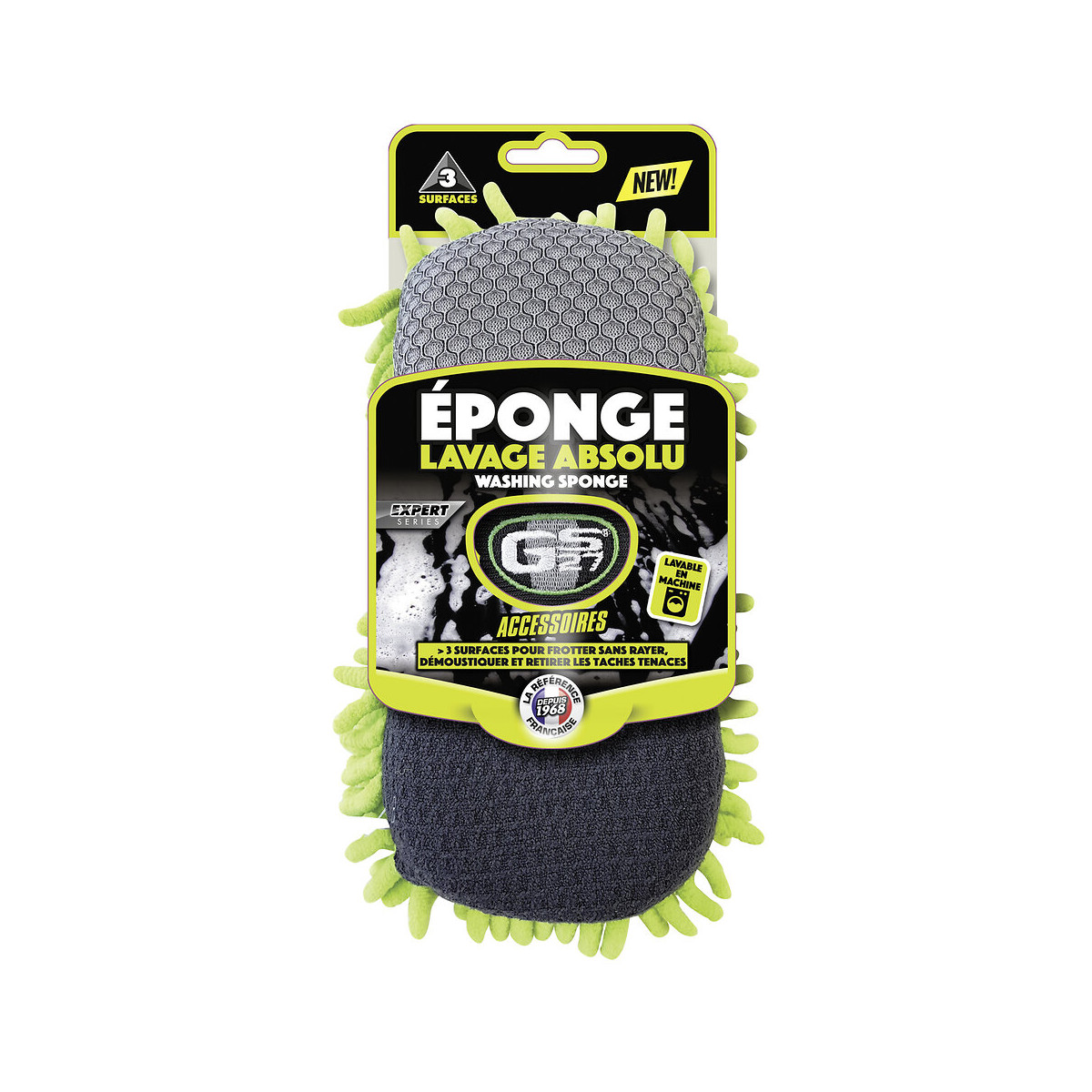 Découvrez la nouvelle éponge de Lavage Absolu GS27® Pratique, sa partie chenillée emporte la saleté sans l?étaler. Sa partie alvéolée (claire) permet de démoustiquer efficacement sans risque de rayures et sa surface micro-fibrée (partie sombre) permet de venir à bout des taches tenaces.Spécifications techniques