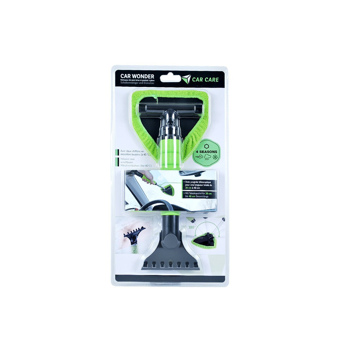 Raclette grattoir pour automobile, 1 coté raclette pivotante avec microfibre pour l'intérieur dun pare-brise, 1 côté grattoir pour l'extérieur.Spécifications techniques