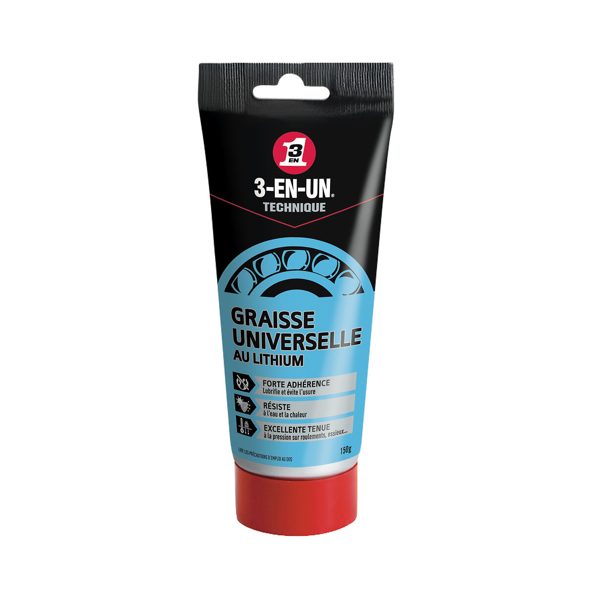 La Graisse Universelle au Lithium 3-EN-UN® TECHNIQUE assure une lubrification longue durée de tous les mécanismes qui roulent, tournent, glissent ou s’emboîtent. Résistante à l’eau et à la pression, adaptée aux conditions extérieures, elle réduit les frottements tout en protégeant de la rouille et de la corrosion. Elle est indiquée pour les moyeux, paliers, galets, engrenages, charnières de portail, etc.Spécifications techniques