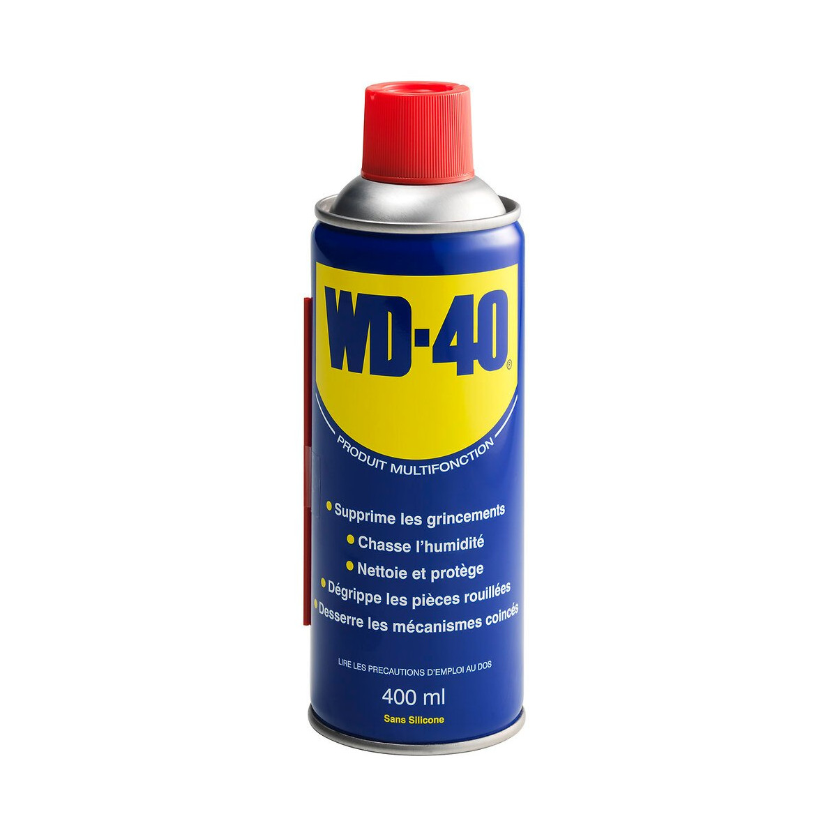 Le Produit Multifonction WD-40 : 1. Chasse l’humidité : élimine rapidement les courts circuits induits par l’humidité ; 2. Dégrippe : la forte adhérence de WD-40 au métal et ses propriétés lubrifiantes assurent ensuite le fonctionnement constant des pièces libérées ; 3. Lubrifie : un des composants principaux de WD-40 est un lubrifiant actif et permanent ; 4. Protège : Le film formé par WD-40 assure une protection contre l'eau, l'humidité et leur effets corrosifs. Cette action est durable et préventive ; 5. Elimine les résidus : WD-40 peut être utilisé sur toutes les surfaces métalliques et plastiques.Spécifications techniques
