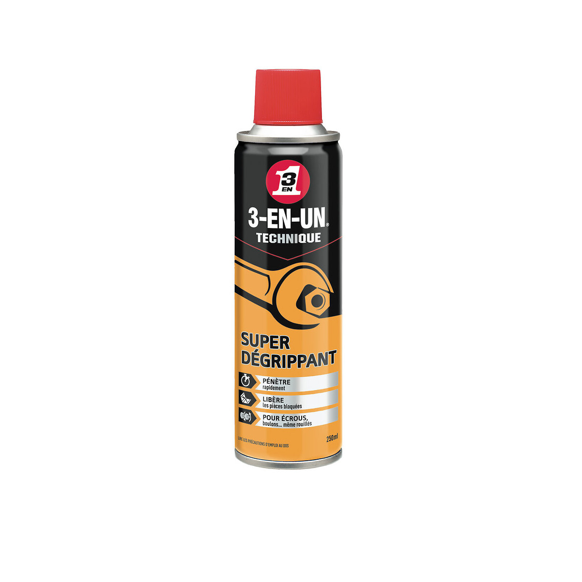 Avec sa formule à action rapide, le Super Dégrippant 3-EN-UN® TECHNIQUE débloque les pièces grippées avec une efficacité renforcée. Issu de vingt mois de recherche par le laboratoire de WD-40 aux États-Unis, ce produit offre un résultat étonnant, même pour un usage industriel : il pénètre dans les parties les plus inaccessibles, disperse la rouille, les salissures et dépôts divers pour libérer les mécanismes corrodés ou coincés.Spécifications techniques