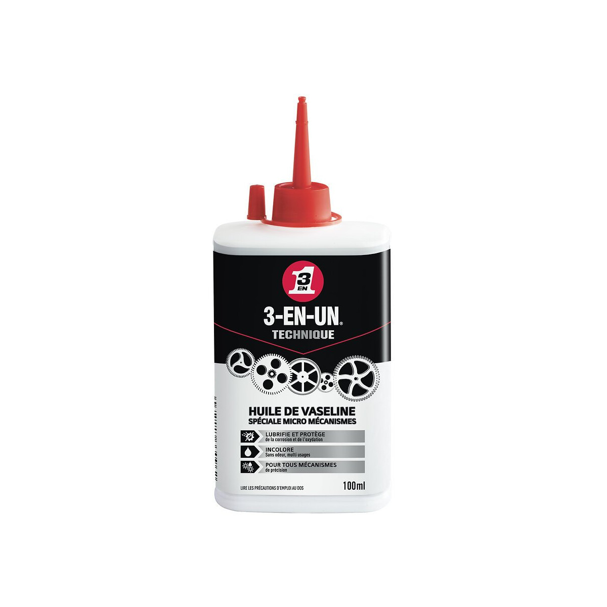 À base de paraffine, l’Huile de Vaseline 3-EN-UN® TECHNIQUE est idéale pour lubrifier les petits mécanismes (appareils ménagers, dispositifs électriques, horlogerie ). Elle pénètre rapidement et proprement, sans laisser d’odeur. Ultra-raffinée, cette huile protège en outre le support traité contre la corrosion et l’oxydation. Grâce à sa burette avec bec verseur et son dosage goutte à goutte, l’application se fait avec un haut niveau de précision.Spécifications techniques