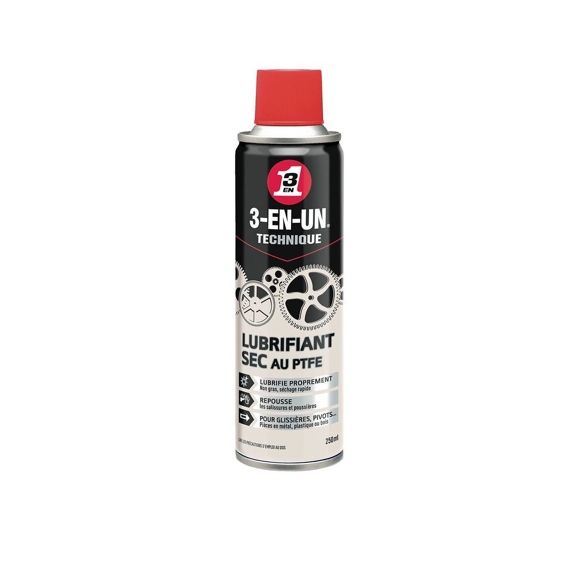 Fortement dosé en PTFE (Polytetrafluorethylène), le Lubrifiant Sec au PTFE 3-EN-UN® TECHNIQUE a été spécialement formulé pour les cas où une lubrification non grasse et anti-adhérente est requise. Il laisse après séchage une fine pellicule blanche qui agit sans attirer les poussières et salissures. La lubrification reste performante, durablement. Recommandé pour les serrures, chaînes, glissières, pivots, convoyeurs, petits mécanismes, mais aussi comme agent de démoulage dans certaines industries.Spécifications techniques