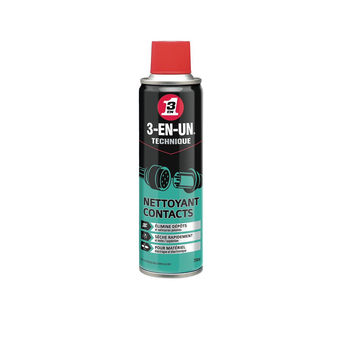 Formulé aux solvants, le Nettoyant Contacts 3-EN-UN® TECHNIQUE supprime les dépôts gras, salissures polaires et saletés diverses sur les équipements électriques et électroniques : contacteurs, interrupteurs, bornes, circuits imprimés, relais, capteurs, etc. Compatible avec la plupart des métaux, plastiques et caoutchoucs, il s’évapore rapidement sans laisser de traces. Il évite l’oxydation et assure un bon fonctionnement des équipements dans le temps.Spécifications techniques